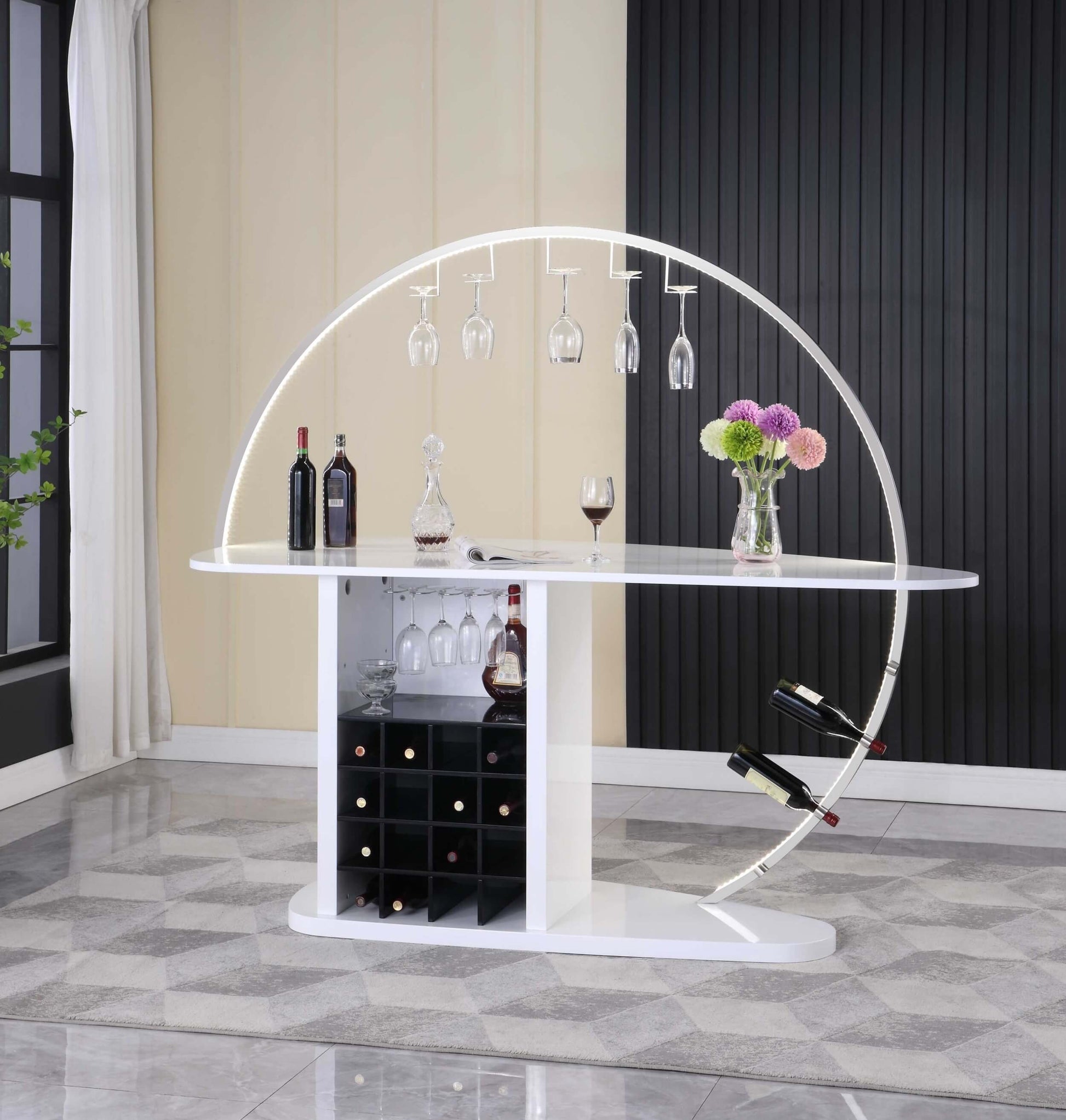 Barra contemporánea Bowery con luces LED personalizables y botelleros, color blanco, de Chintaly Imports
