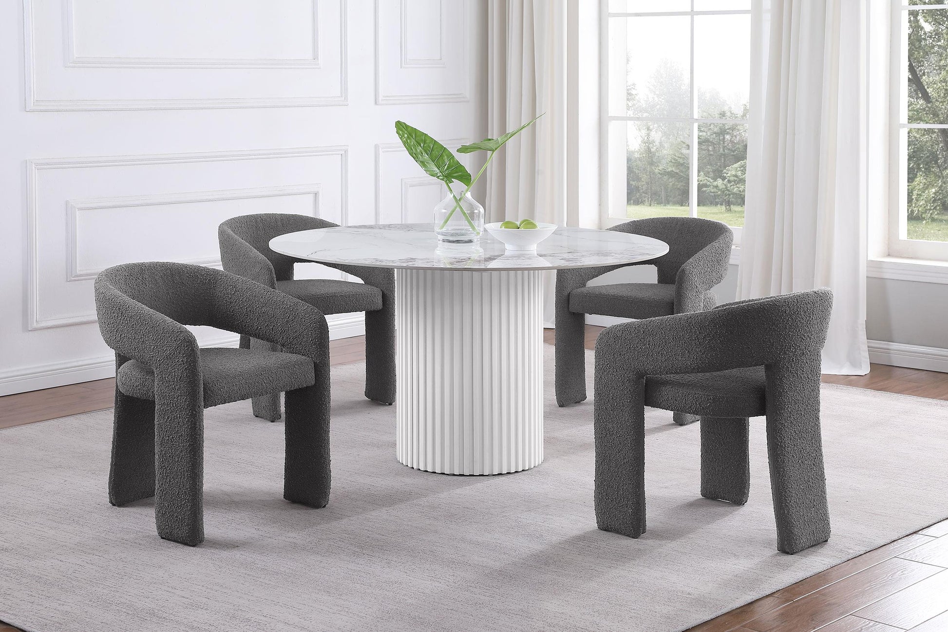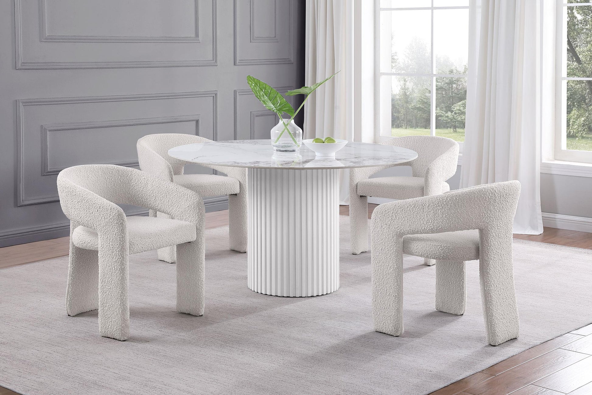 Meet Acadia, a round dining table that blends modern design with everyday practicality. Featuring a 53-inch diameter sintered stone top in a crisp white finish, it accommodates generous seating while keeping a sleek silhouette. Ideal for contemporary dining rooms, kitchens, or open-plan spaces that welcome gathered meals and conversation.
