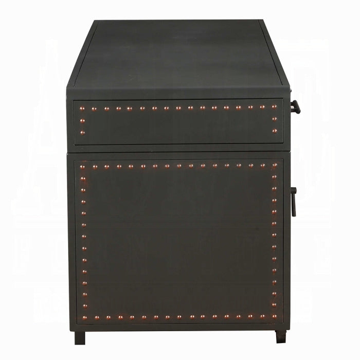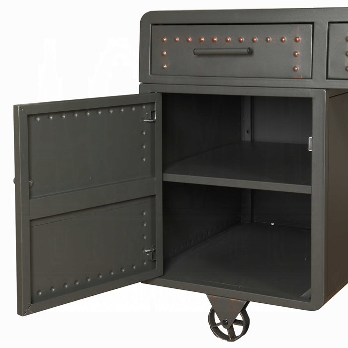 - Gray finish with industrial-style wheels for mobility and a contemporary, rugged look.