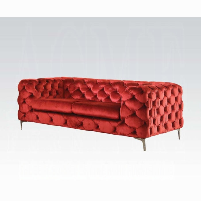 Elegant and eye-catching, the Adam loveseat is the perfect addition to any living space. Draped in rich red velvet, it brings warmth and sophistication to a room while offering everyday comfort for sitting, lounging, and entertaining.