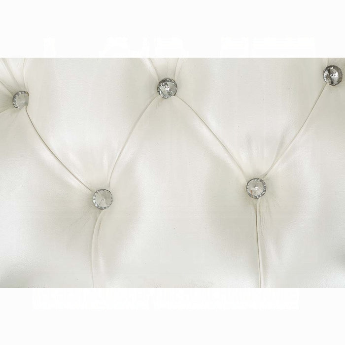 Introducing the Adara Bench — a modern interpretation of the ornate Rococo style crafted for living spaces, entryways, and vanity areas. It blends classic detailing with contemporary materials to elevate any space. The synthetic leather upholstery pairs with an antique white frame accented by light gold hand-brushed details for a refined, versatile look.