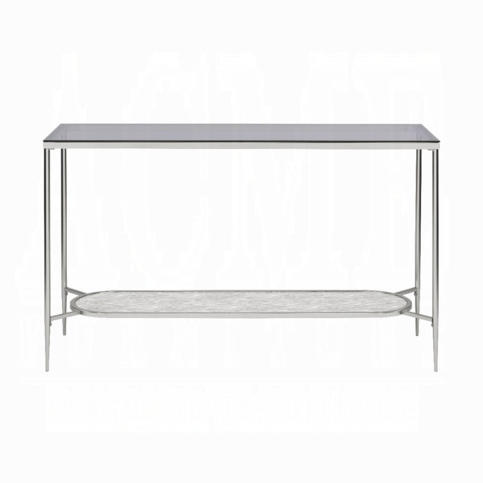 The Adelrik Sofa Table is a sleek, modern accent designed to elevate living spaces. Ideal for entryways, living rooms, or lounges, it combines a tempered glass top with a polished chrome-finished metal frame for a clean, contemporary look that blends with a variety of décors.