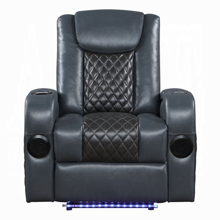 Meet the Alair Power Motion Recliner, designed for movie nights and gaming sessions. This chair blends comfort with convenience, featuring a spacious 22" wide seat and modern blue and black leather-aire upholstery. Built-in dual Bluetooth speakers, a wireless charging pad, and a practical cupholder make it the centerpiece of your living room or home theater.