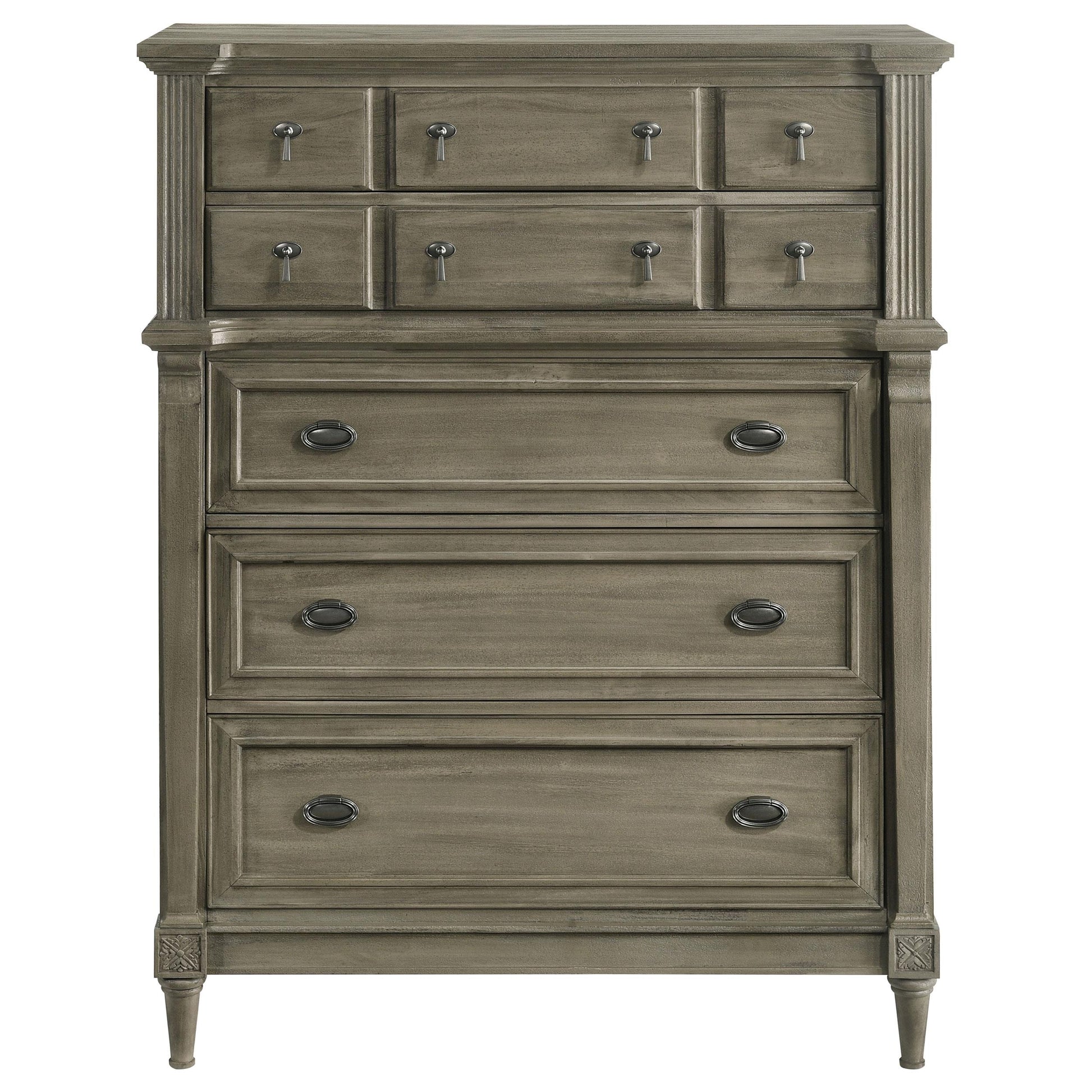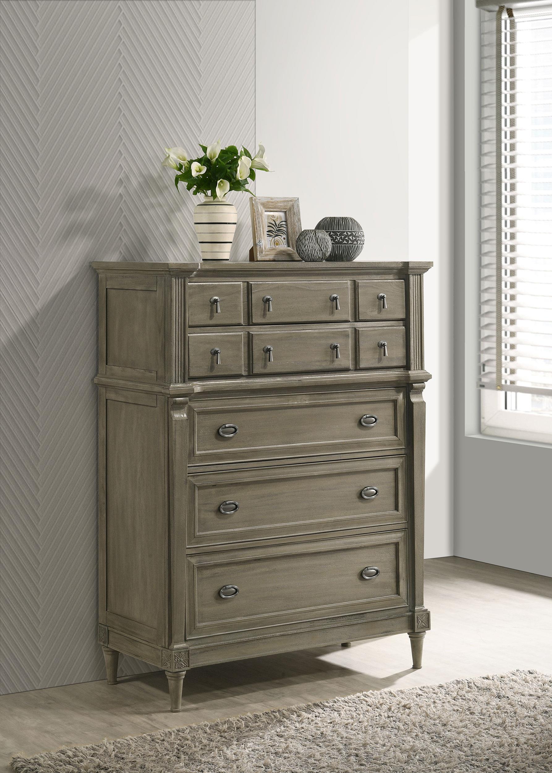 Meet the Alderwood 5-drawer Bedroom Chest in French Grey—a practical storage piece designed for organized, serene bedrooms. This chest offers ample drawer space and a timeless finish that blends with a variety of decors. Crafted with restrained, quality details, it brings both function and style to your room.