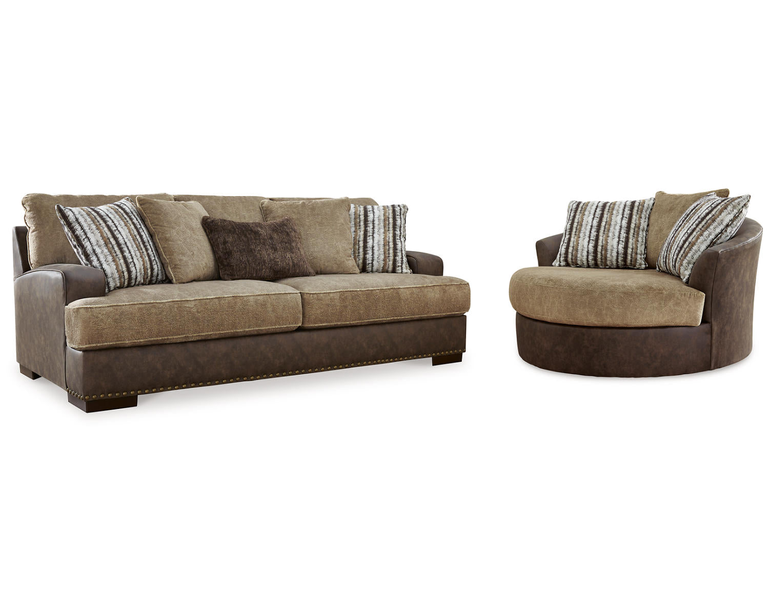 - Includes: a sofa and an oversized swivel accent chair within a single coordinated set.