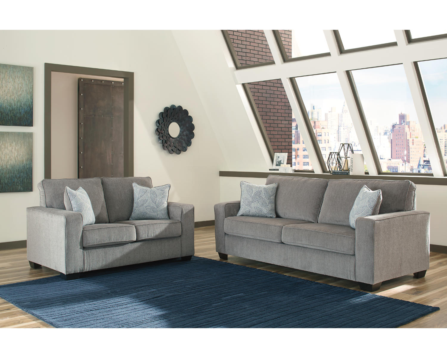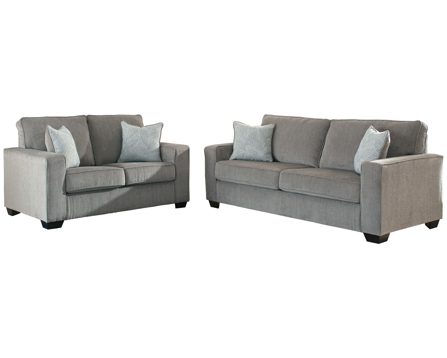 - Two-piece set: includes a sofa and a loveseat in a coordinated Alloy finish