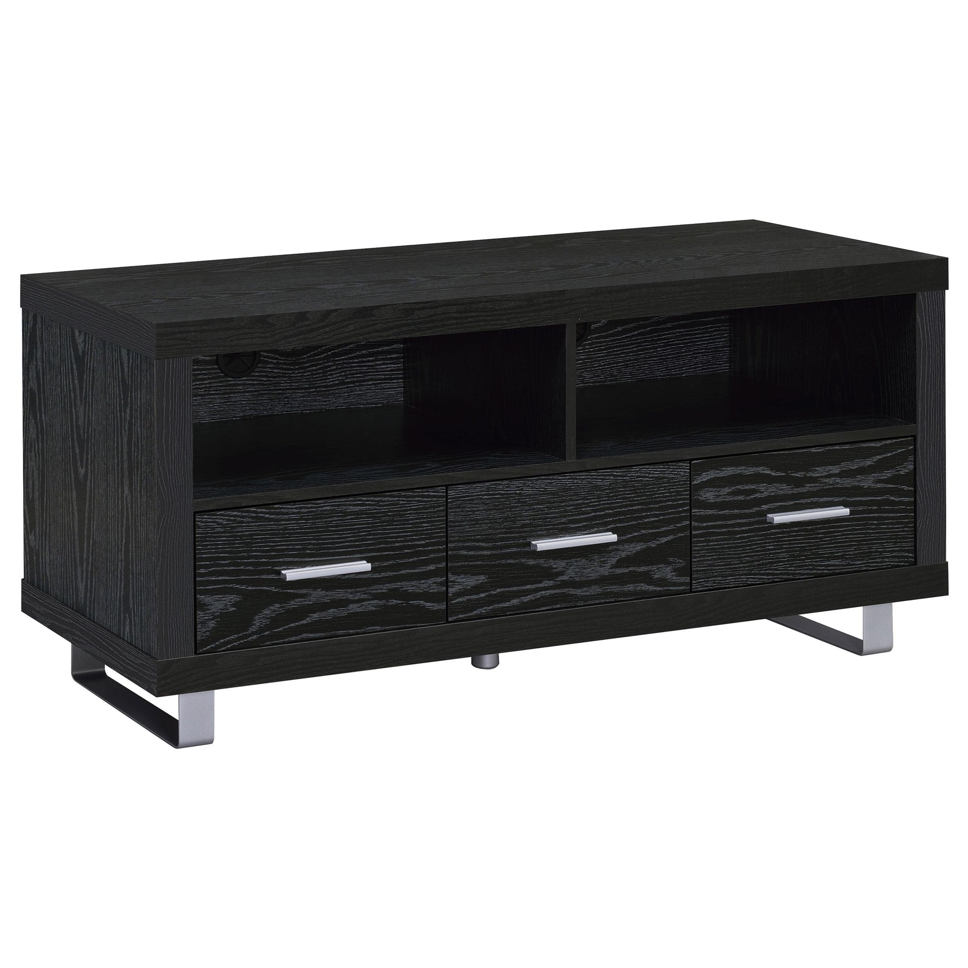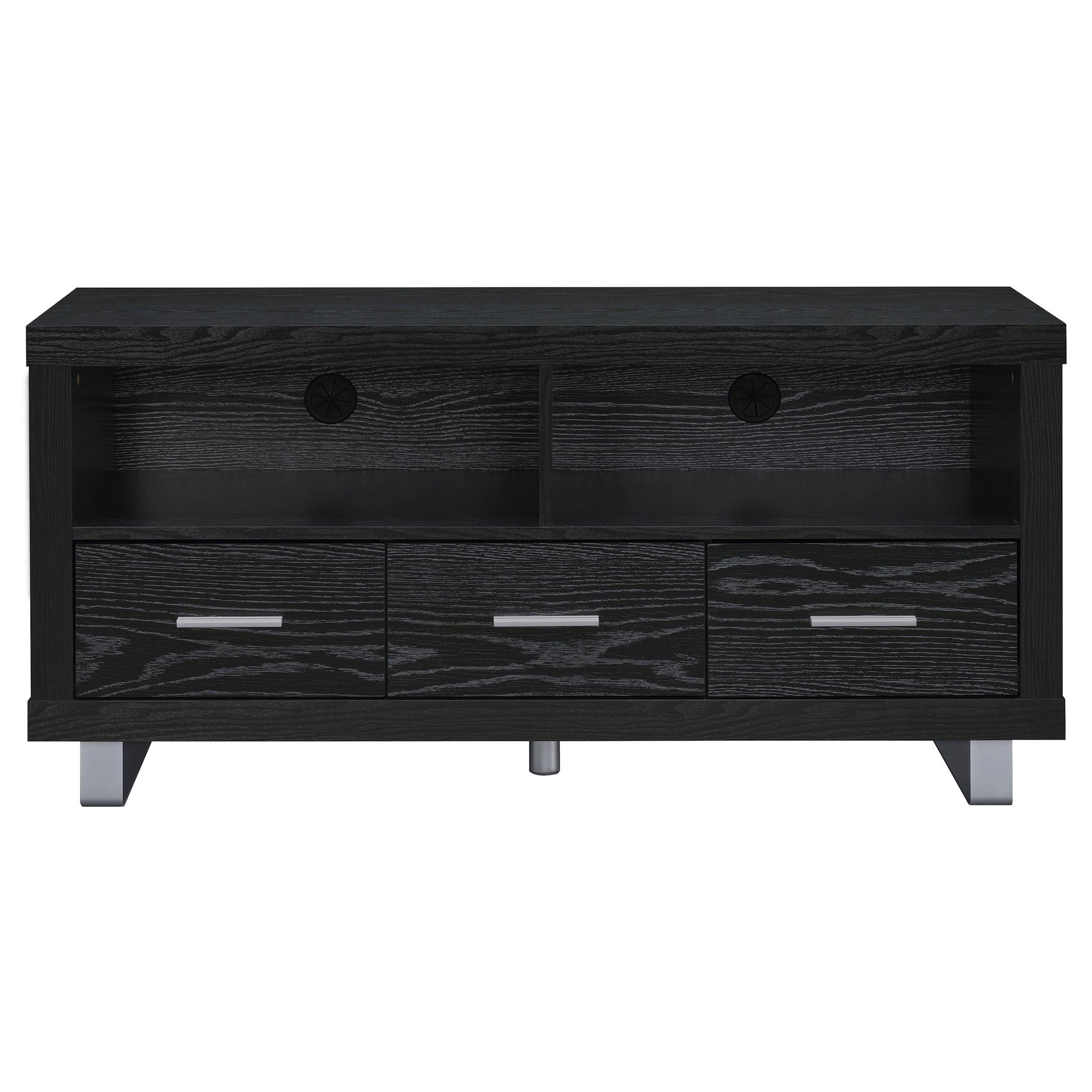 - Three drawers provide concealed storage for remotes, cables, and accessories