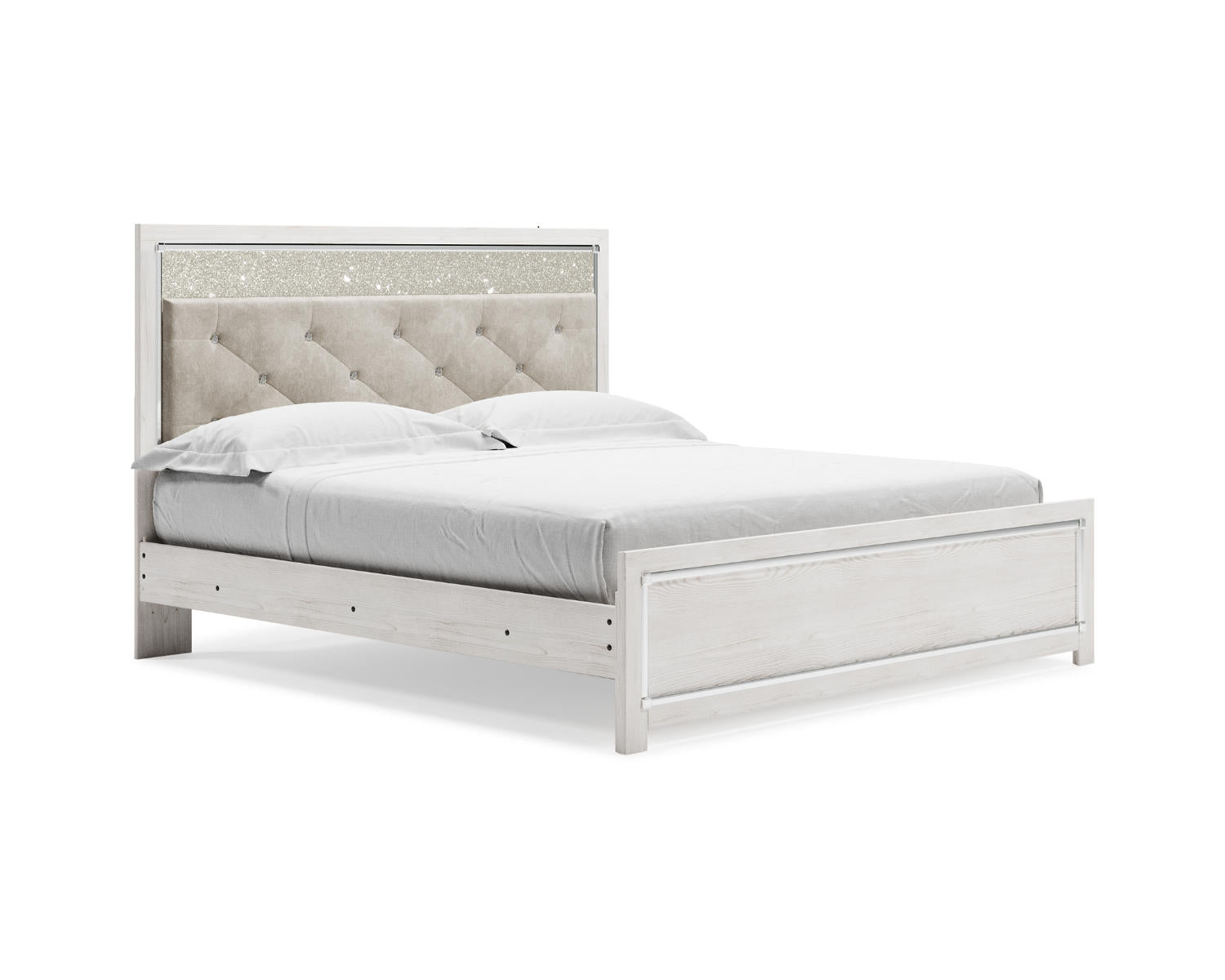 Altyra King Panel Bed, Dresser and Mirror in a crisp white finish is a complete bedroom set designed for modern spaces. Built for couples and individuals seeking a cohesive, timeless look, this white bedroom set offers a clean, streamlined silhouette that anchors the room and coordinates effortlessly with other decor.