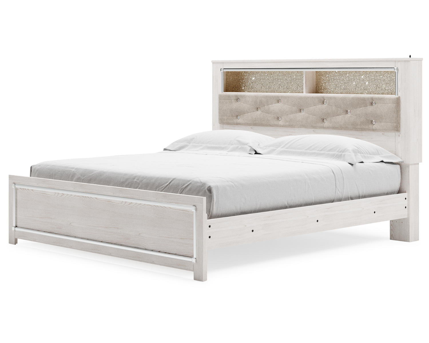 Introducing the Altyra King Panel Bookcase Bed in White — a versatile, king-size solution designed for modern bedrooms. It blends a sturdy sleeping platform with built-in storage, offering a clean, uncluttered look with practical bookcase shelves for bedtime essentials.