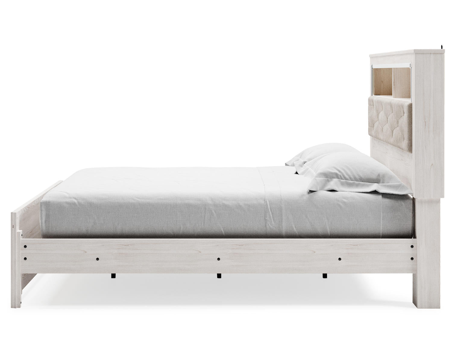 - Built-in bookcase headboard with open shelves to store books, decor, and daily essentials within reach.