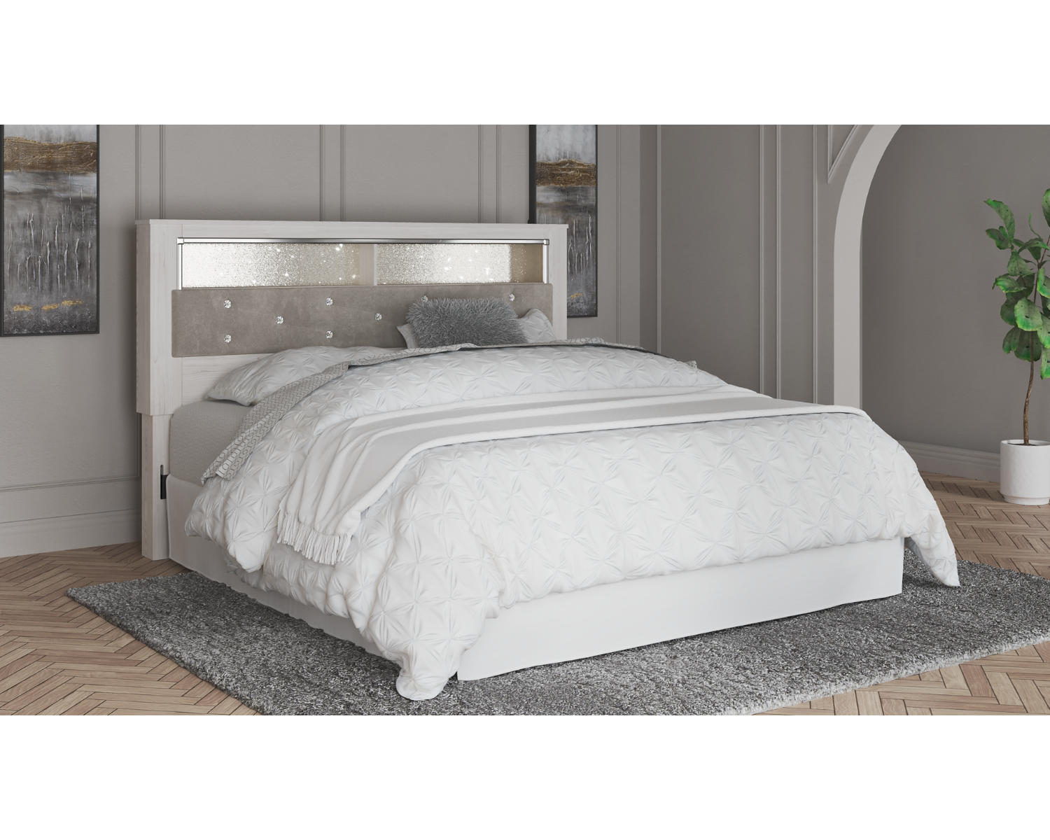 Introducing the Altyra King Upholstered Panel Bookcase Headboard in white—where comfort meets thoughtful storage. This king-size headboard is designed for bedrooms that value both style and practicality. It adds a clean, modern centerpiece while giving you convenient shelves within reach.