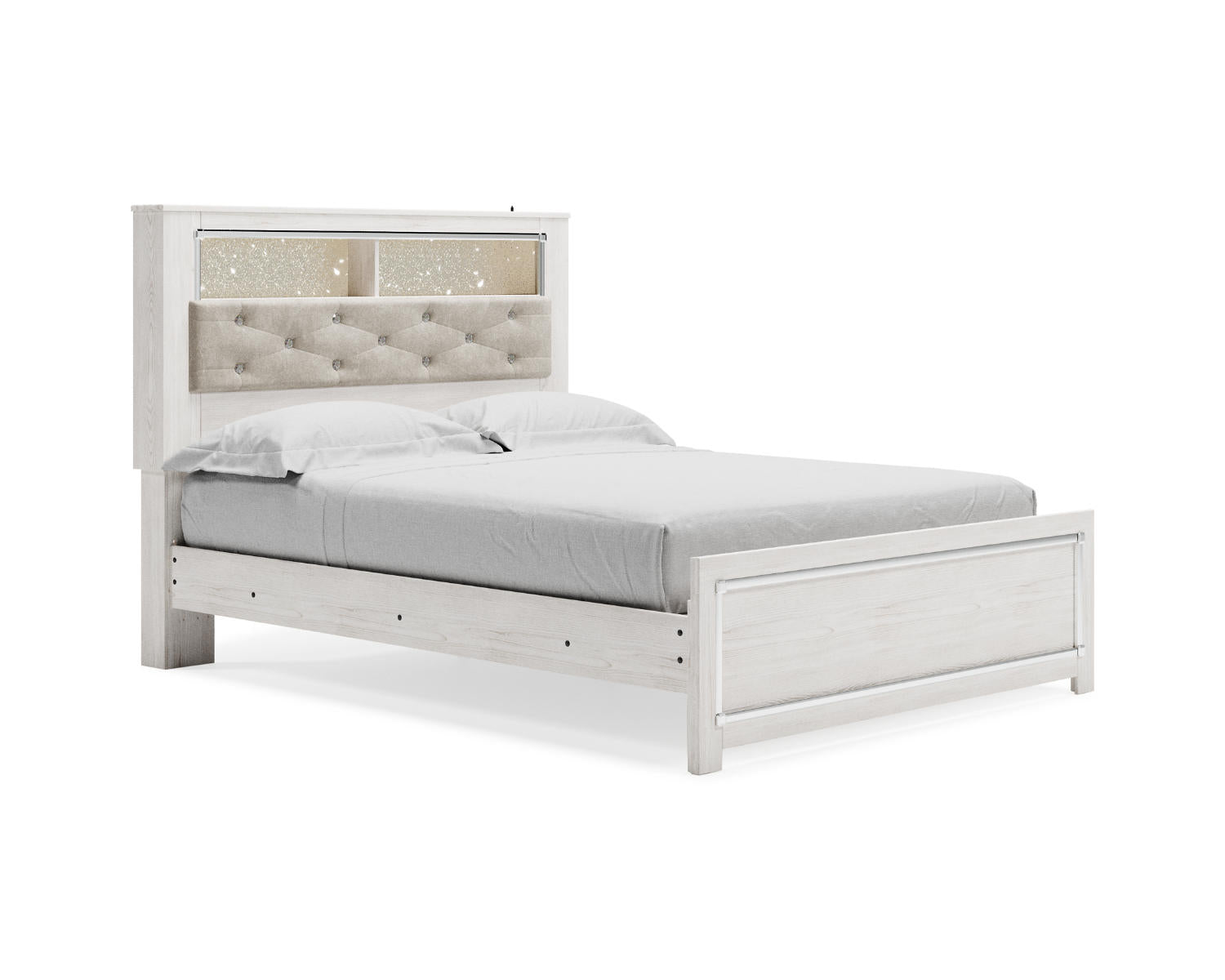 Discover the Altyra, a complete bedroom solution designed for modern spaces. This queen-sized panel bed features a built-in bookcase headboard, paired with a matching dresser and wall-mounted mirror. In a crisp white finish, it offers a clean, timeless look that blends with a variety of decors and helps you maximize storage without sacrificing style.