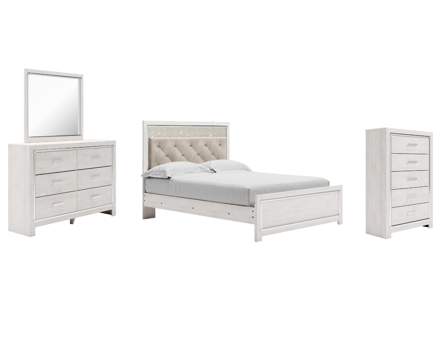 Altyra Queen Upholstered Panel Bed, Dresser, Mirror, and Chest
