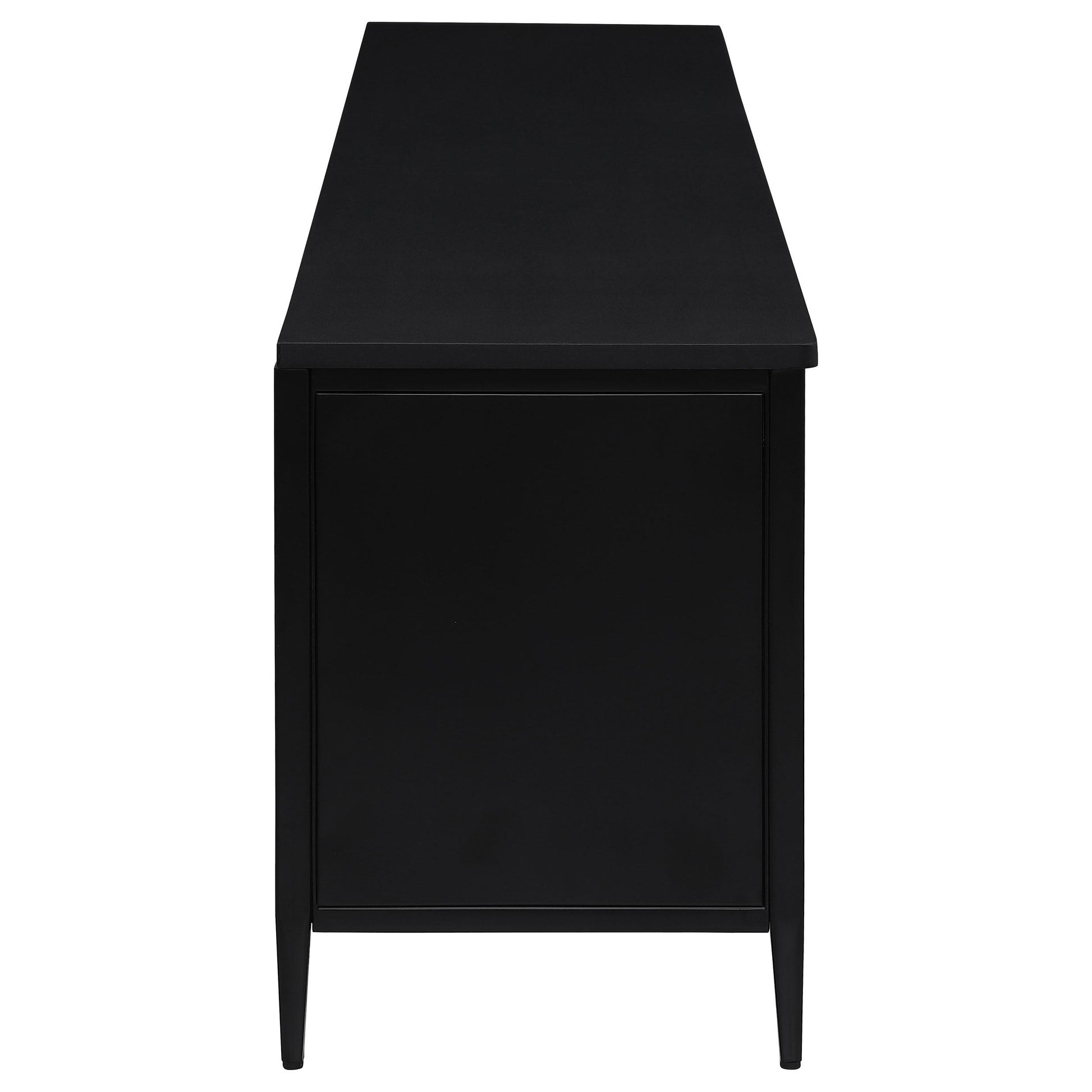 Meet the Amherst 4-door 78-inch Metal TV Stand Media Console in Black — a sturdy, stylish home for your large TV and media components. Designed for modern living spaces, it blends industrial style with practical storage. With its four concealed doors, it keeps cords and media neatly tucked away while maintaining a clean, contemporary look.