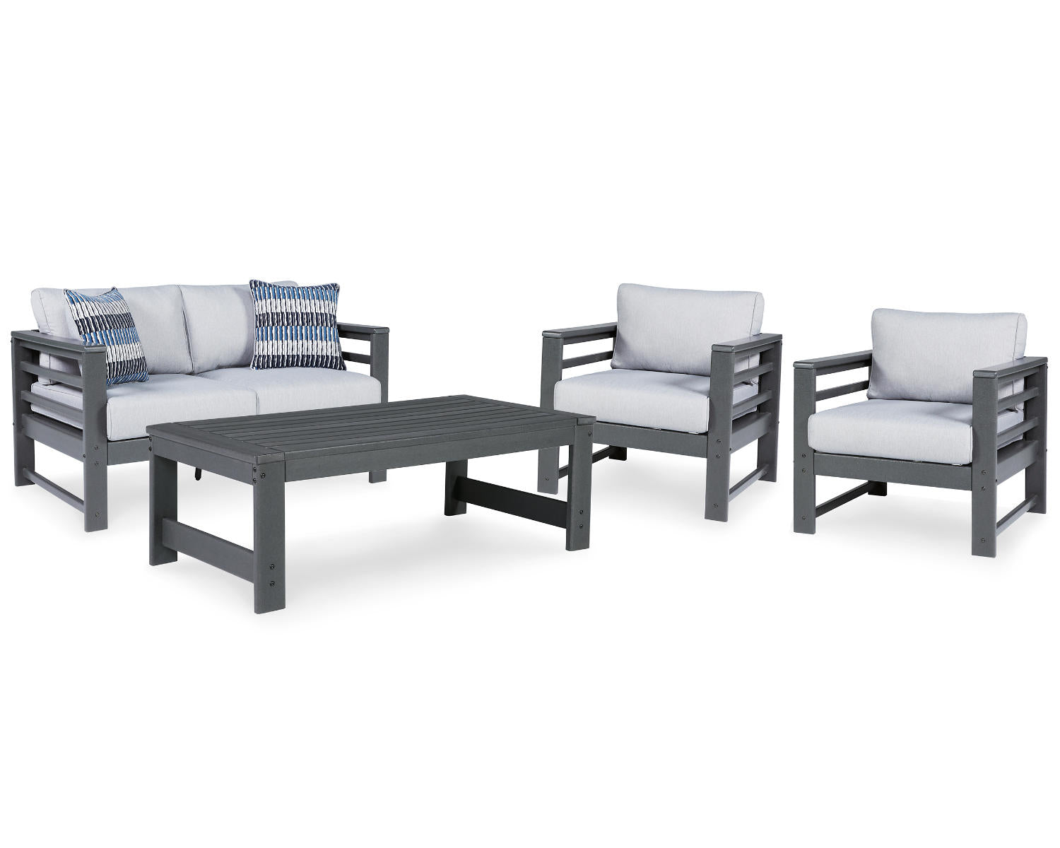 - Complete 4-piece set: Loveseat, two lounge chairs, and a coffee table