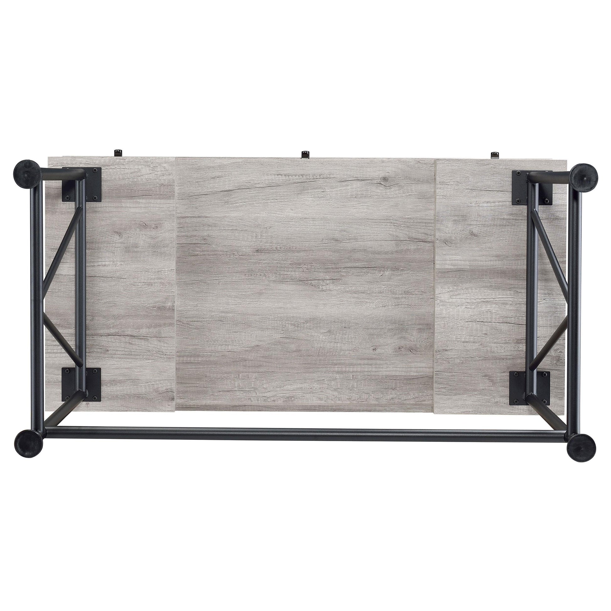 - Grey driftwood finish paired with black hardware for a contemporary, versatile look.