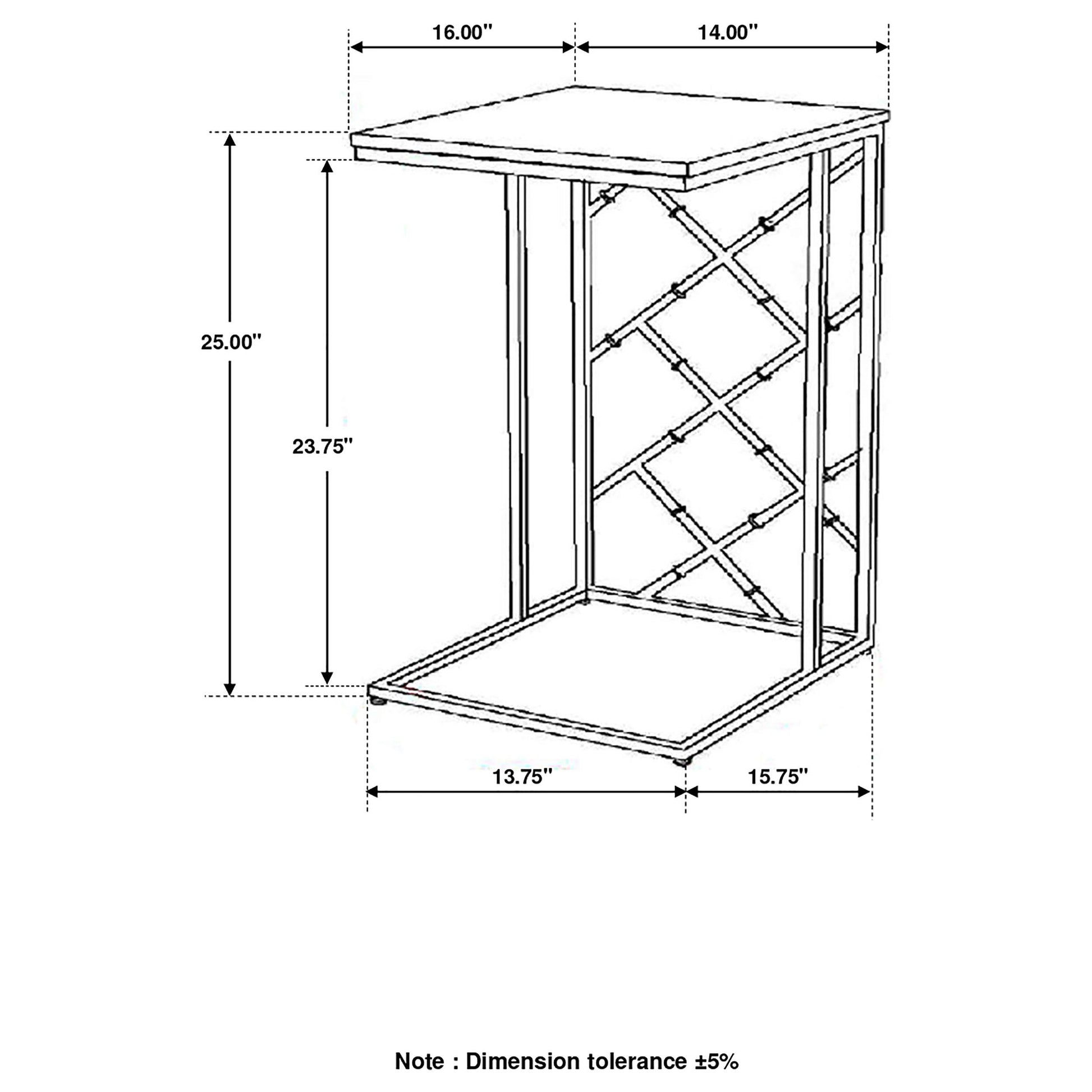 - C-shape silhouette slides neatly beside seating, saving floor space without sacrificing functionality.