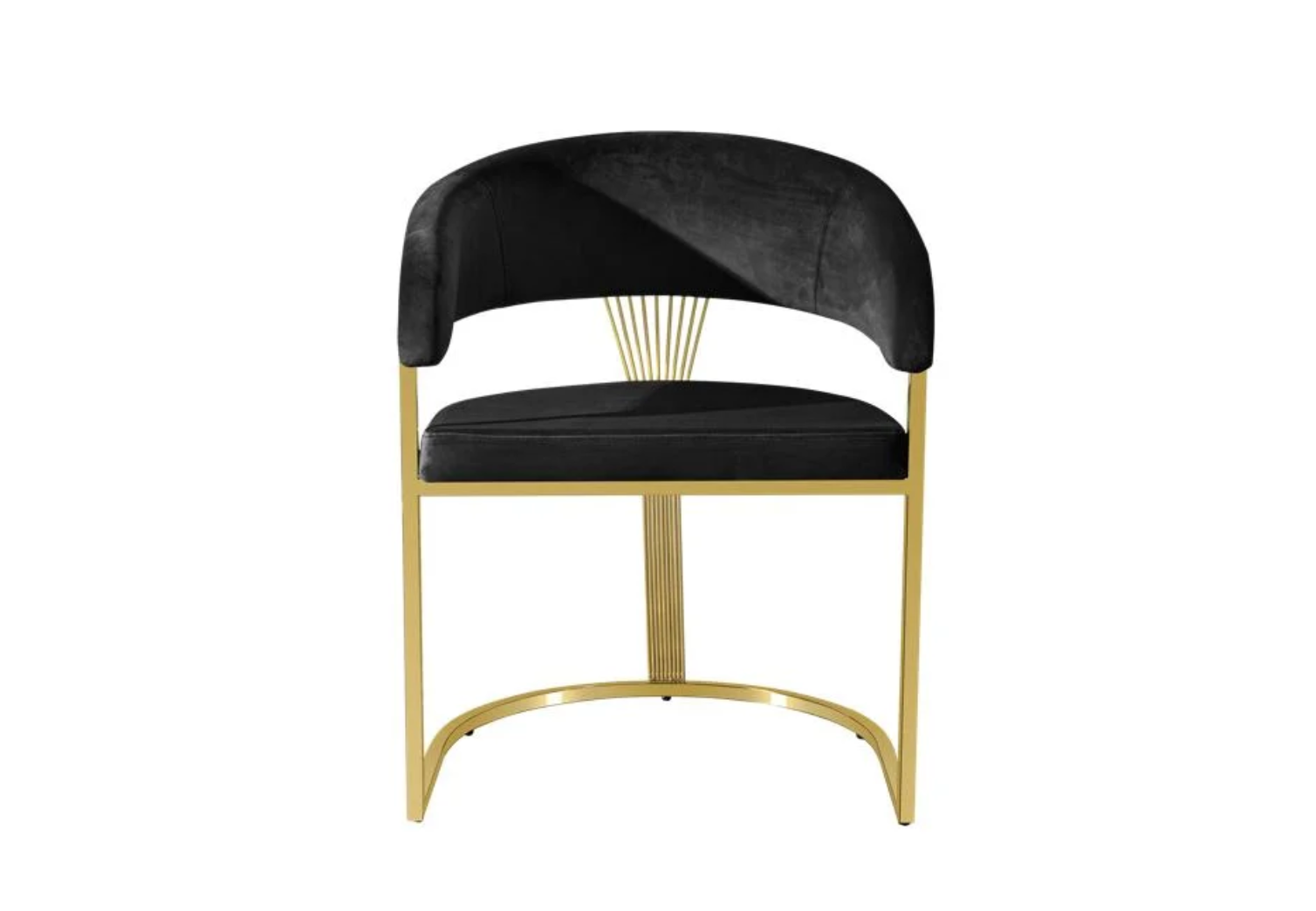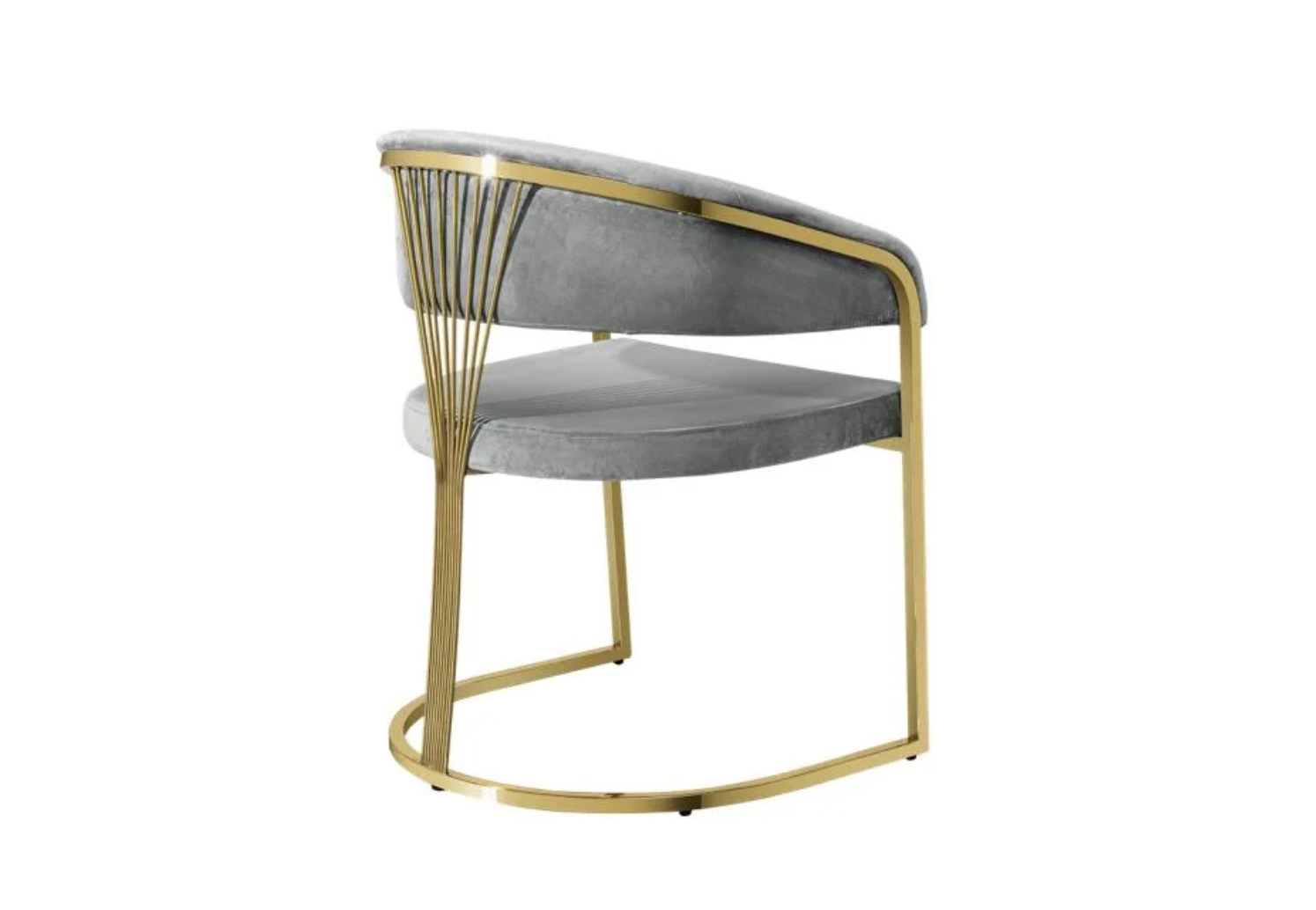 Meet the Annie Velvet Dining Chair—a modern, refined seating solution for dining rooms and upscale lounges. It combines plush grey velvet upholstery with a curved gold stainless steel frame to create a striking, contemporary silhouette. The open-back design adds visual lightness while keeping comfort at the forefront, making it a versatile choice for stylish interiors.