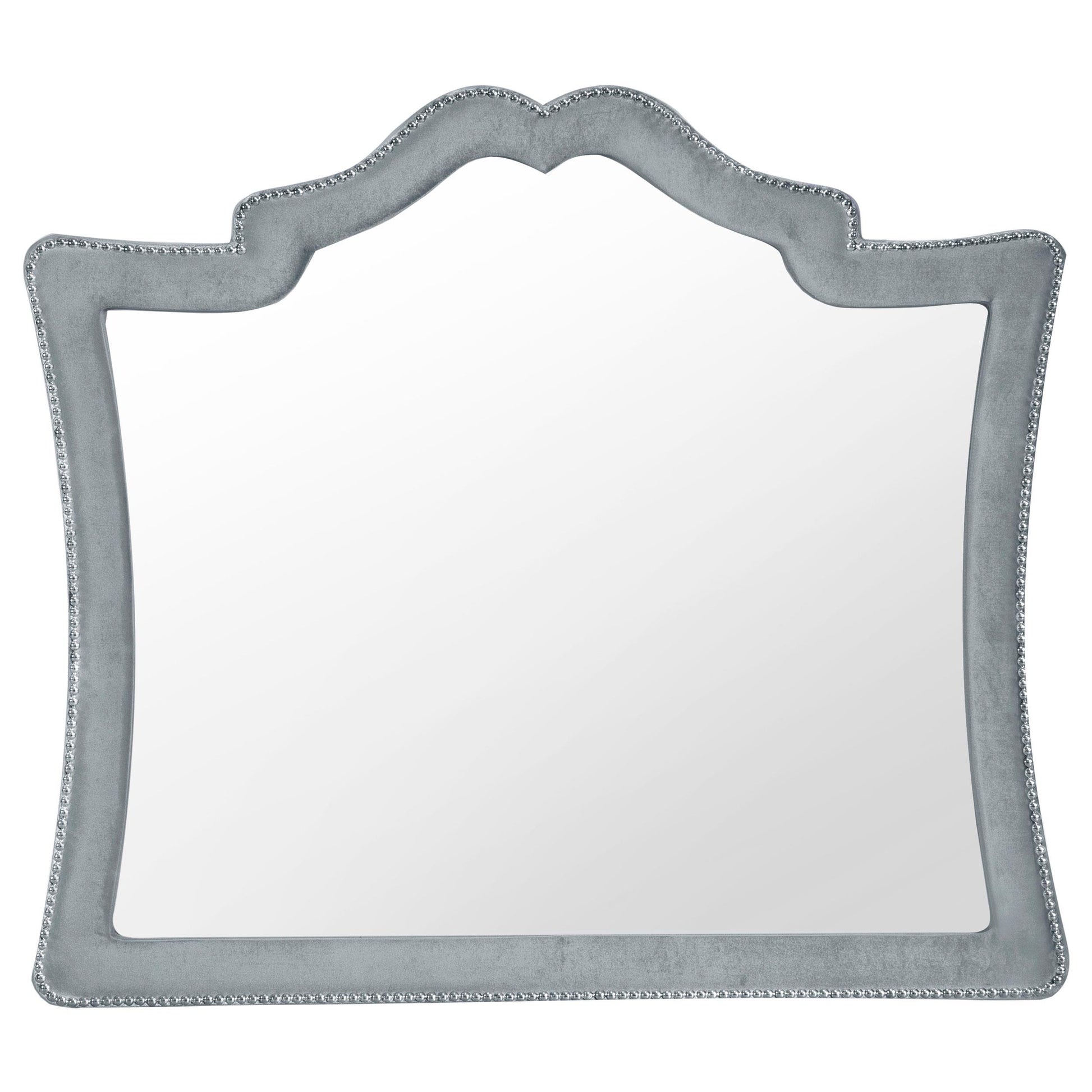 - Grey upholstered frame adds a soft, contemporary touch to any vanity or dresser setup