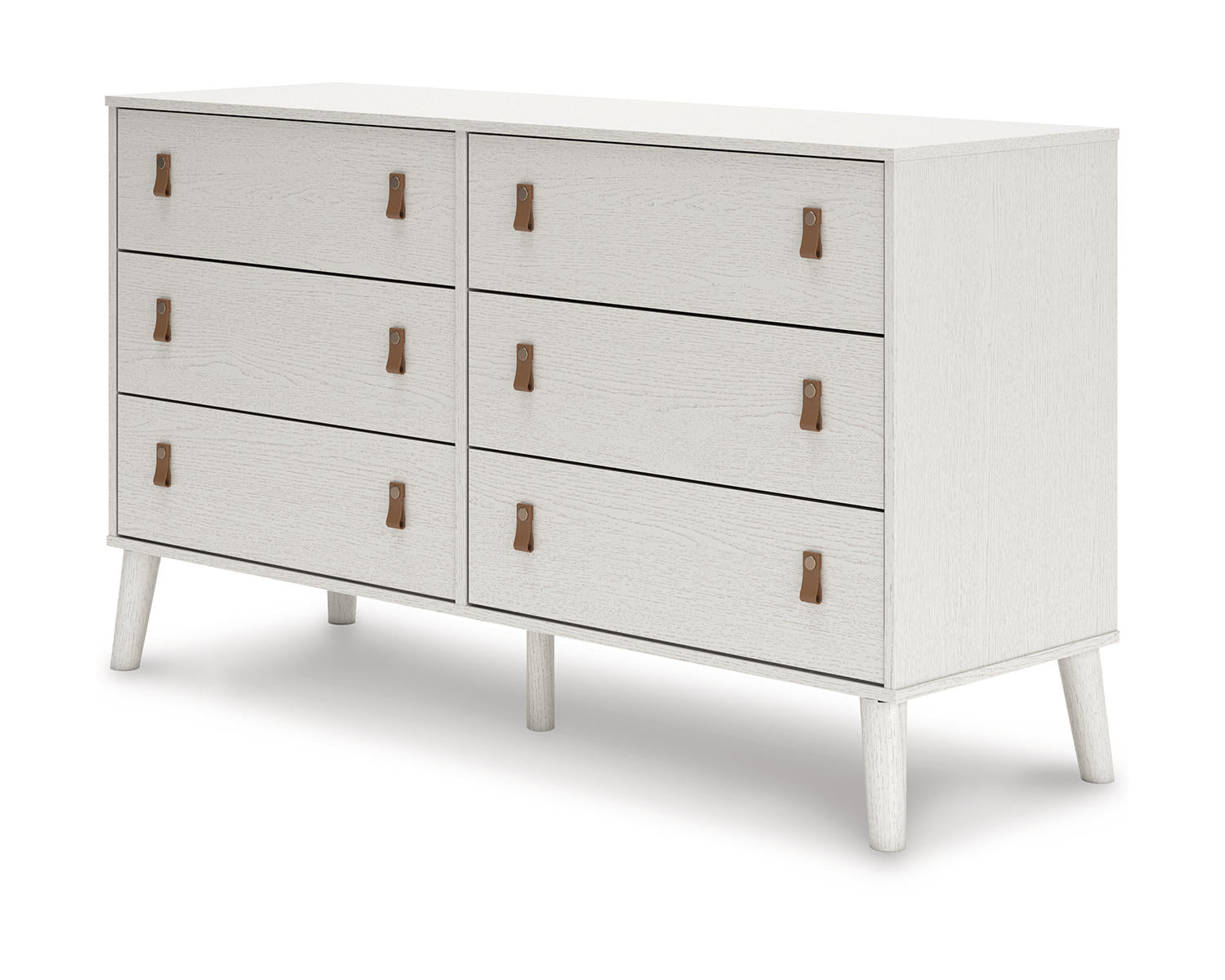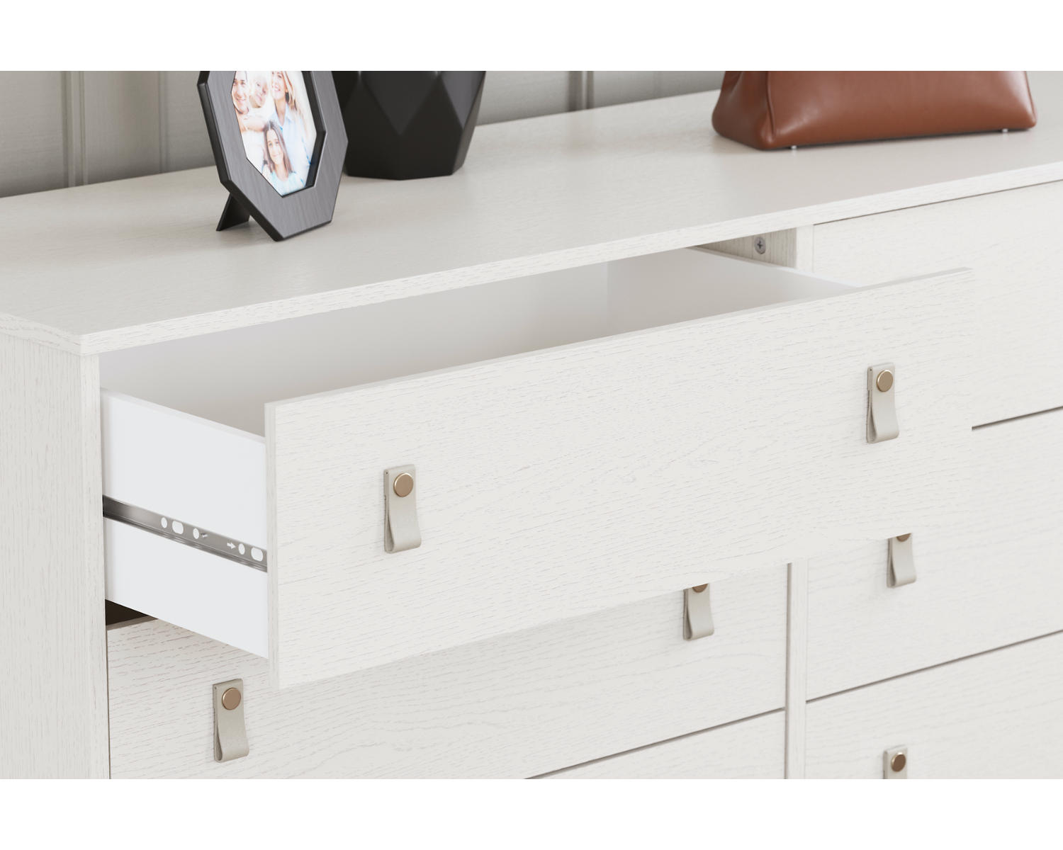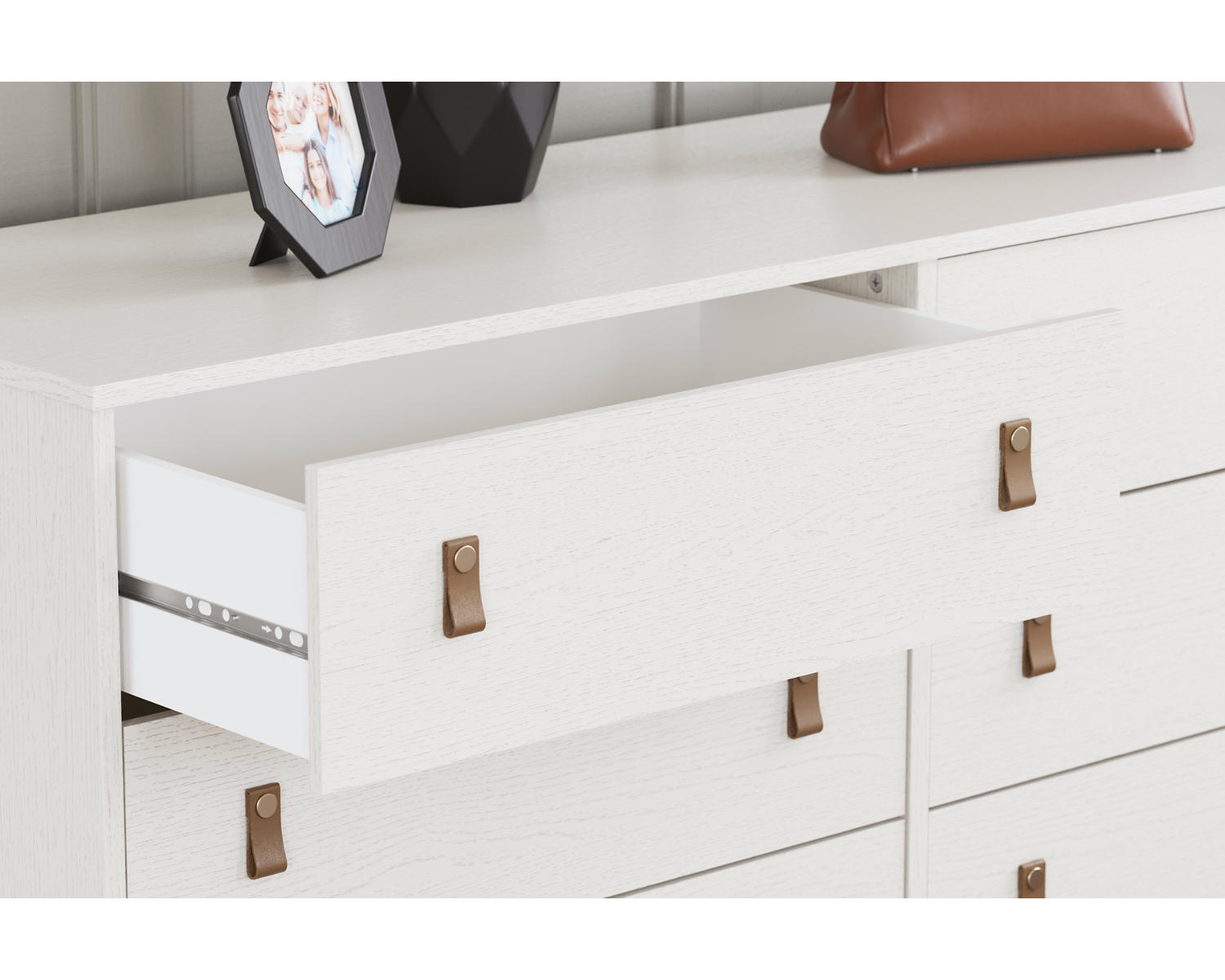 The Aprilyn Dresser is a six-drawer storage solution designed for bedrooms, apartments, and guest rooms. Its crisp white finish adds a fresh, minimalist touch while providing practical organization for everyday outfits and essentials. Simple, reliable, and versatile, it fits a wide range of decor styles.