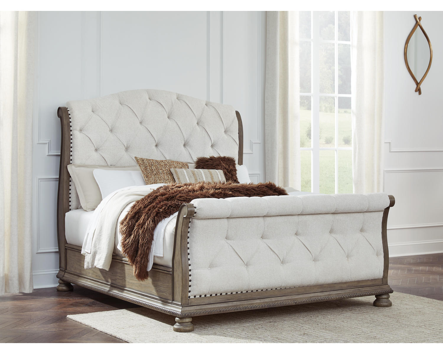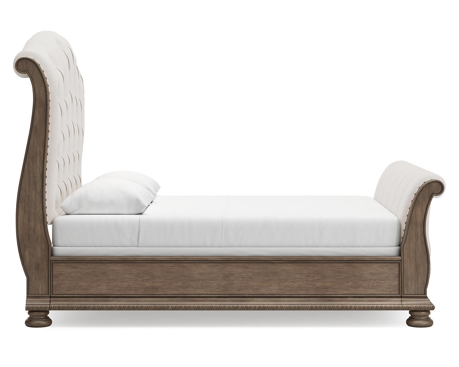 The Ardenfield Queen Upholstered Sleigh Bed blends timeless elegance with modern comfort, making it a refined centerpiece for any bedroom. Designed for those who appreciate a warm, inviting feel, this bed features a graceful sleigh silhouette and plush light brown upholstery.