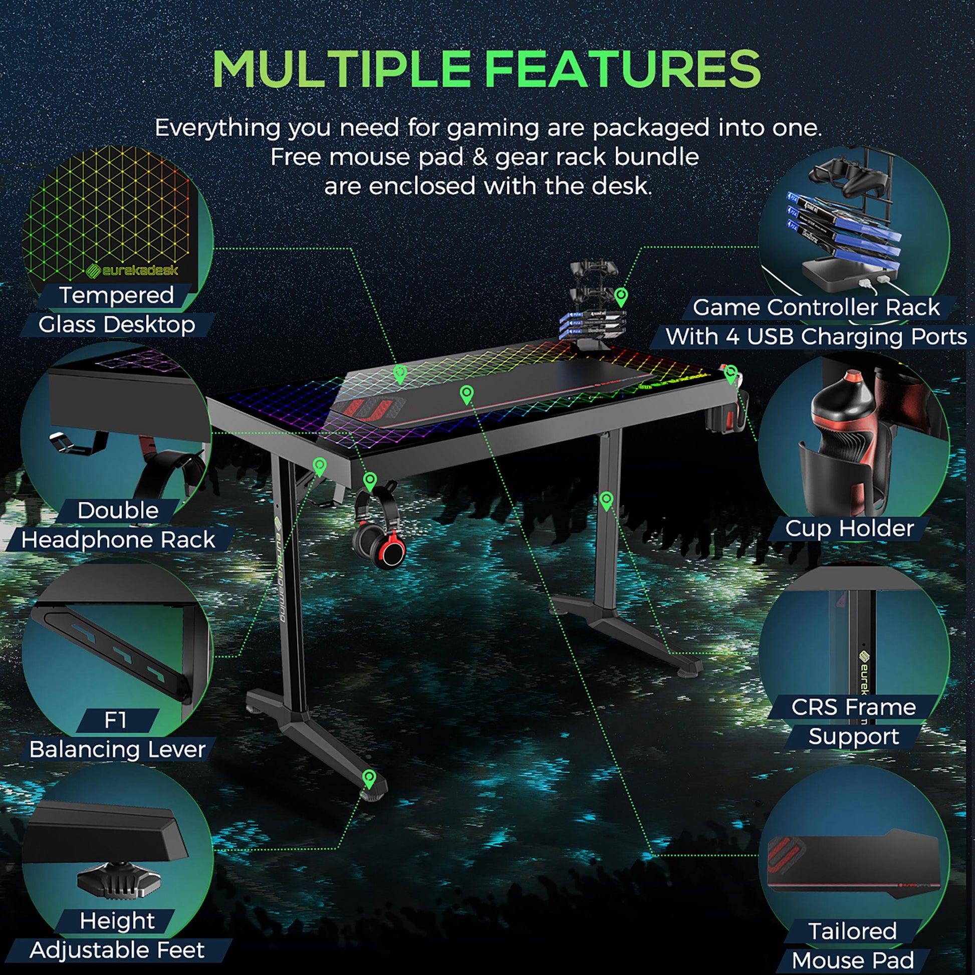 Avoca 43-Inch RGB LED Glass Top Computer Gaming Desk — Black