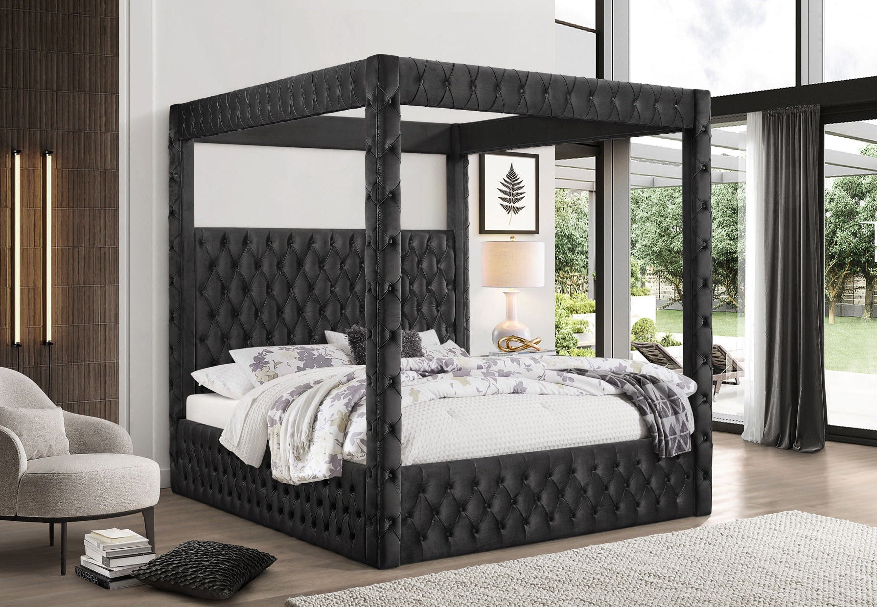 Make a bold statement in your bedroom with this glamorous grey velvet tufted canopy bed. The intricately designed frame features deep tufting on the headboard, footboard, and canopy posts, exuding luxury from every angle. The soft grey velvet upholstery adds elegance and versatility to any sleep space.