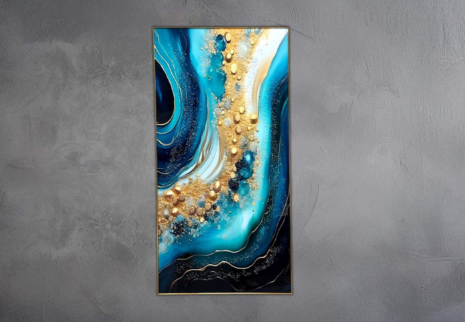 Azure Flow artwork is a mesmerizing abstract piece that blends deep blues with shimmering gold. Designed for art lovers and modern interiors, it brings movement and energy to any wall. Evoking the rhythm of ocean currents and celestial energy, this piece serves as a sophisticated focal point in living rooms, bedrooms, or workspaces.