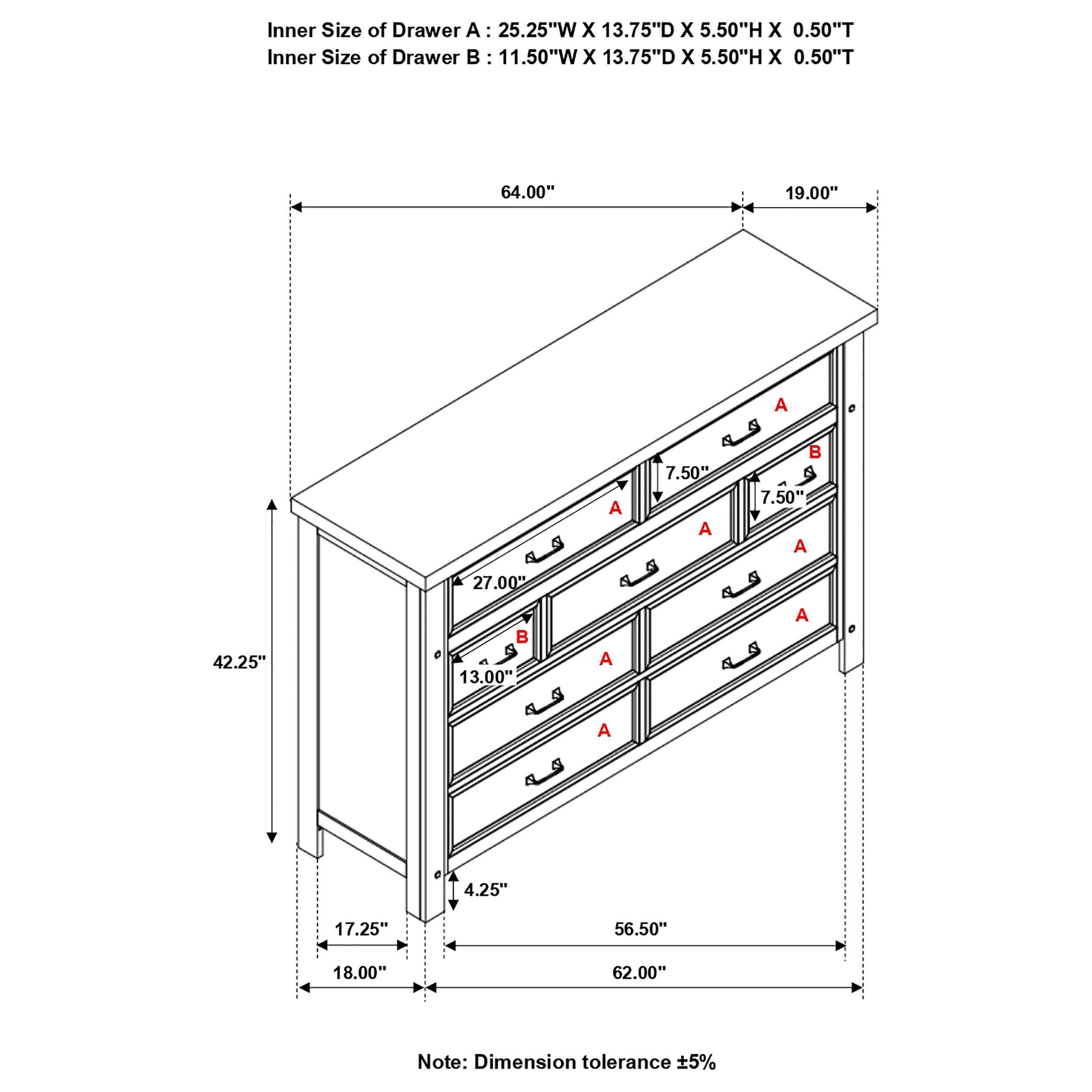 - Nine drawers provide ample storage for clothing, accessories, and essentials