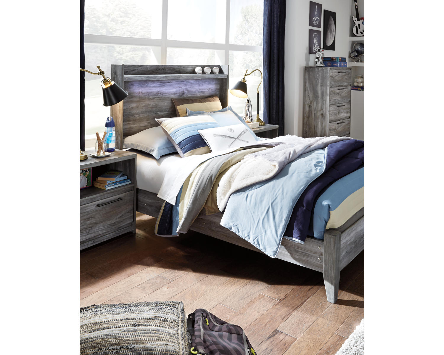 - Includes: a full panel bed and a coordinating chest in a Gray finish