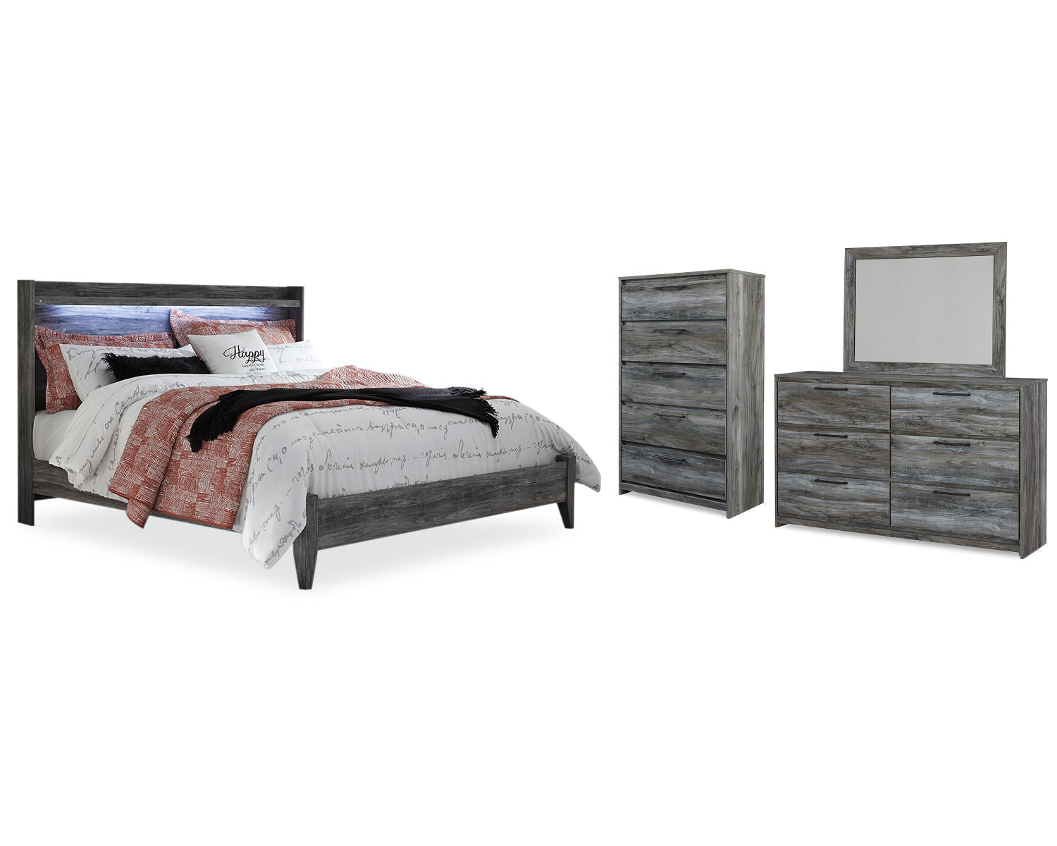 Bring a cohesive, modern look to your bedroom with the Baystorm King Panel Bed, Dresser, Mirror & Chest in Gray. This all-in-one set is designed for those who appreciate clean lines, versatile color, and practical storage. Create a calm retreat with a complete, coordinated suite that elevates any master or guest room.