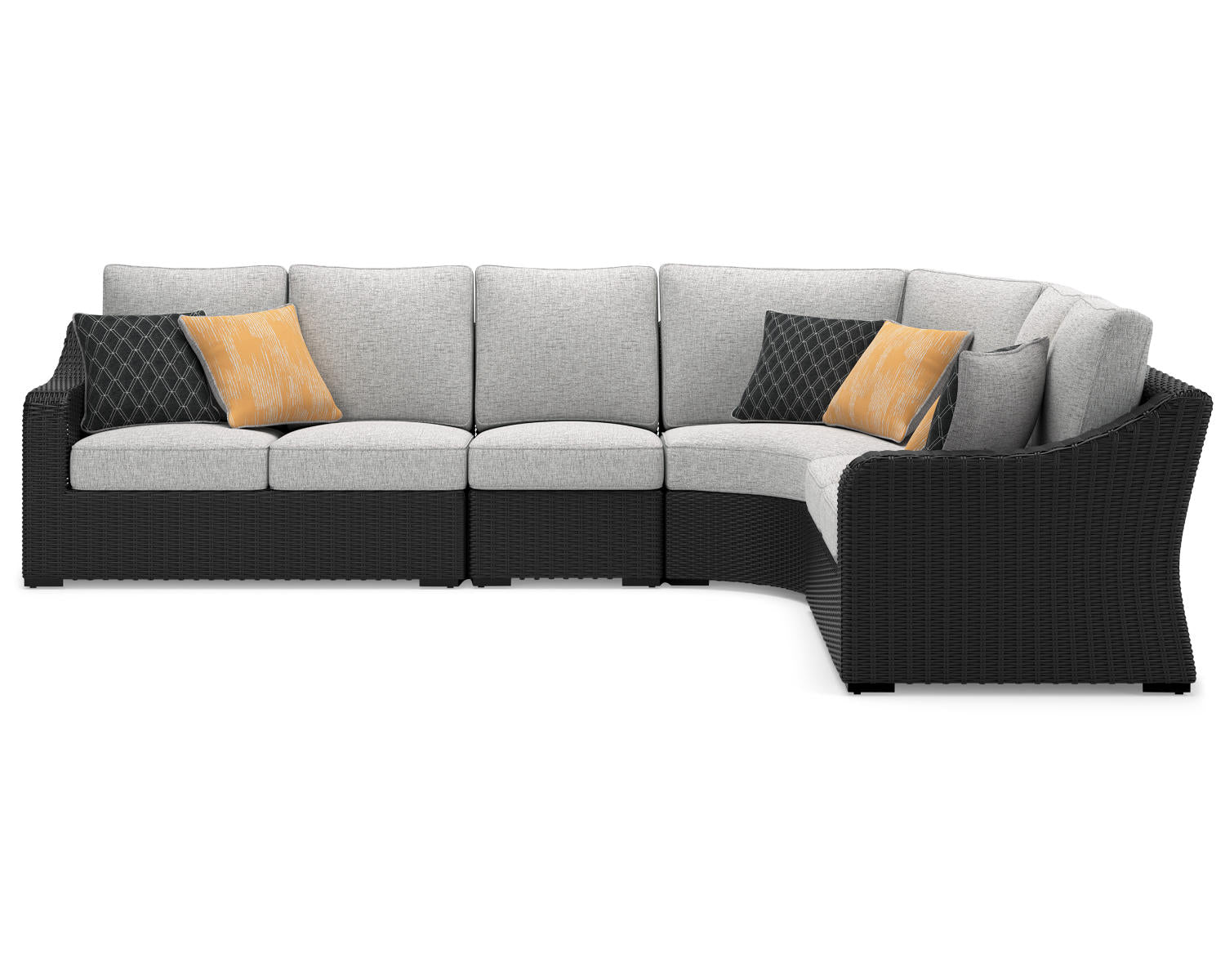 Experience outdoor lounging with the Beachcroft 4-Piece Outdoor Sectional. This modular set is designed for patios, decks, and poolside spaces. The Black and Light Gray color pairing offers a contemporary look that adapts to your exterior décor and entertaining style.