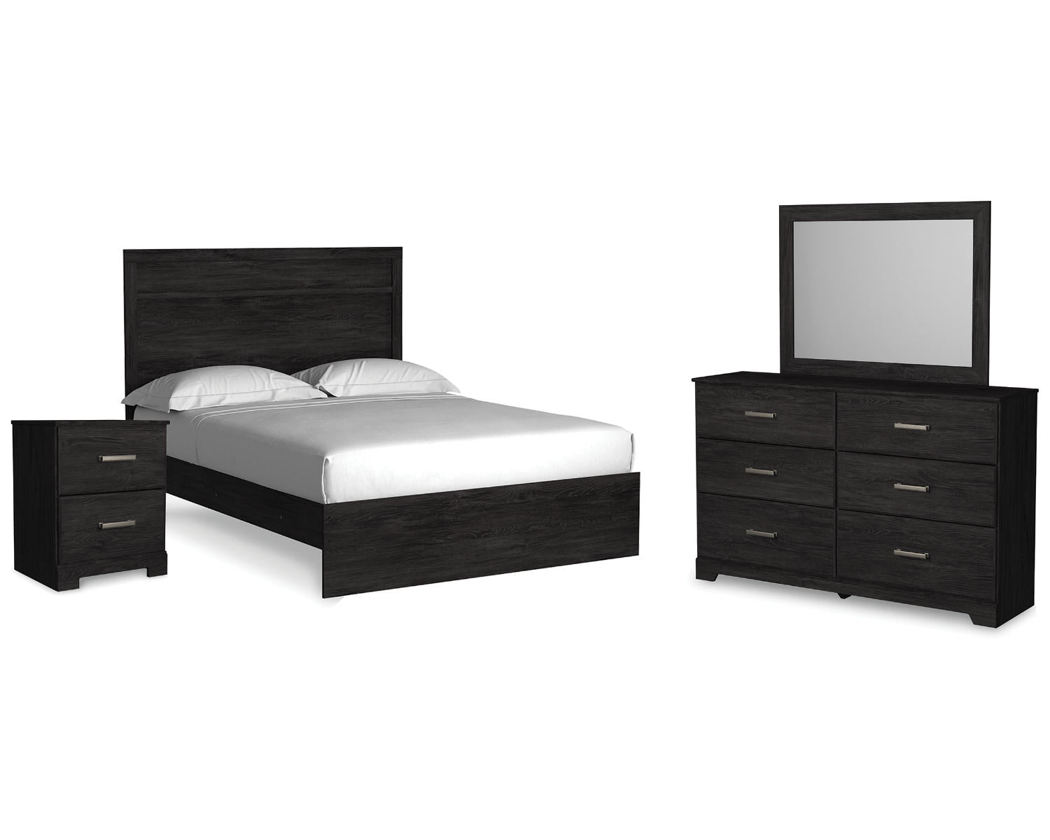 - Complete four-piece suite: Queen panel bed, dresser, mirror, and nightstand in a matching charcoal finish
