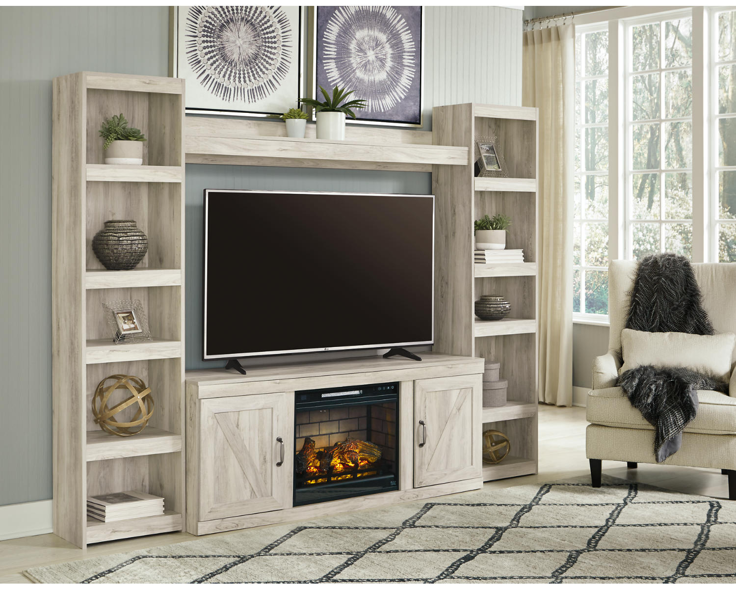 Meet the Bellaby 4-Piece Entertainment Center in a Whitewash finish — a versatile all-in-one solution for modern living rooms. This 4-piece modular set combines media storage with a built-in electric fireplace to create a warm, organized focal point for family movie nights and casual gatherings. Designed for today’s spaces, it pairs clean lines with practical function.