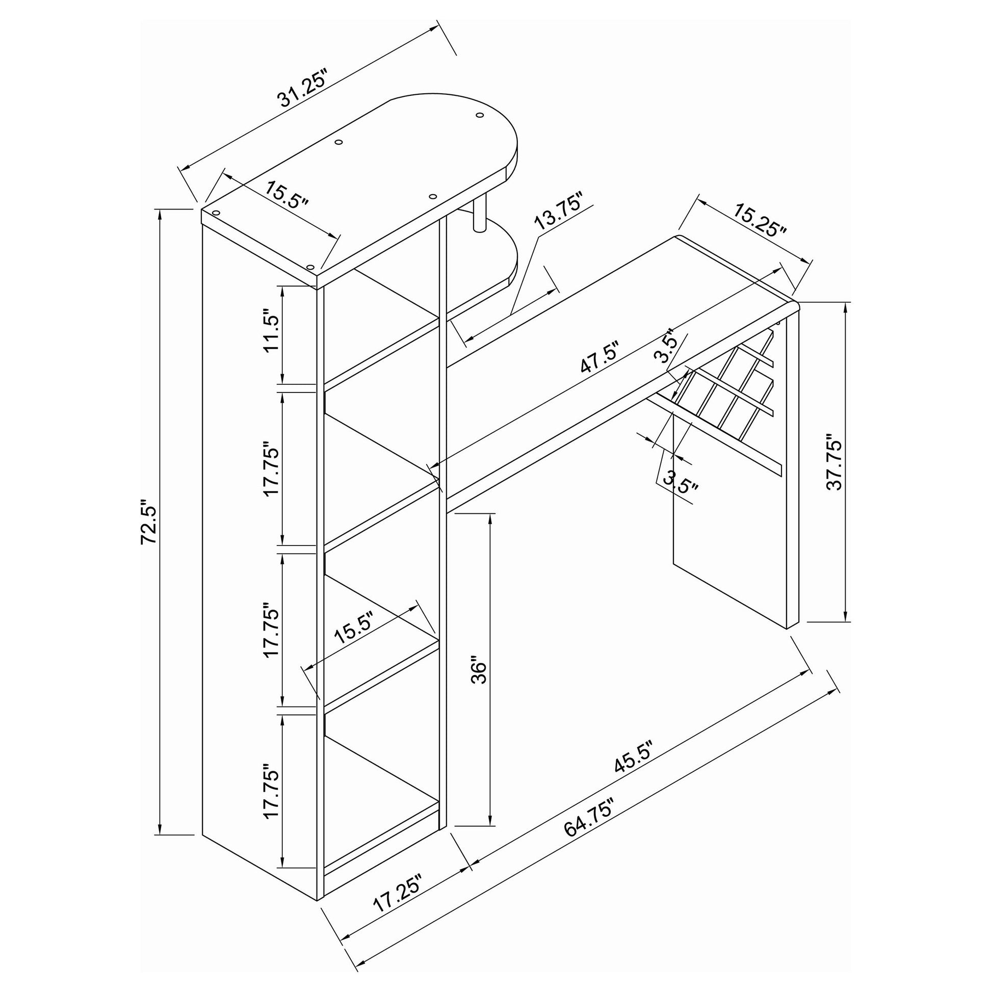 - 5-shelf configuration: arranged to store wine bottles, glassware, and bar essentials.