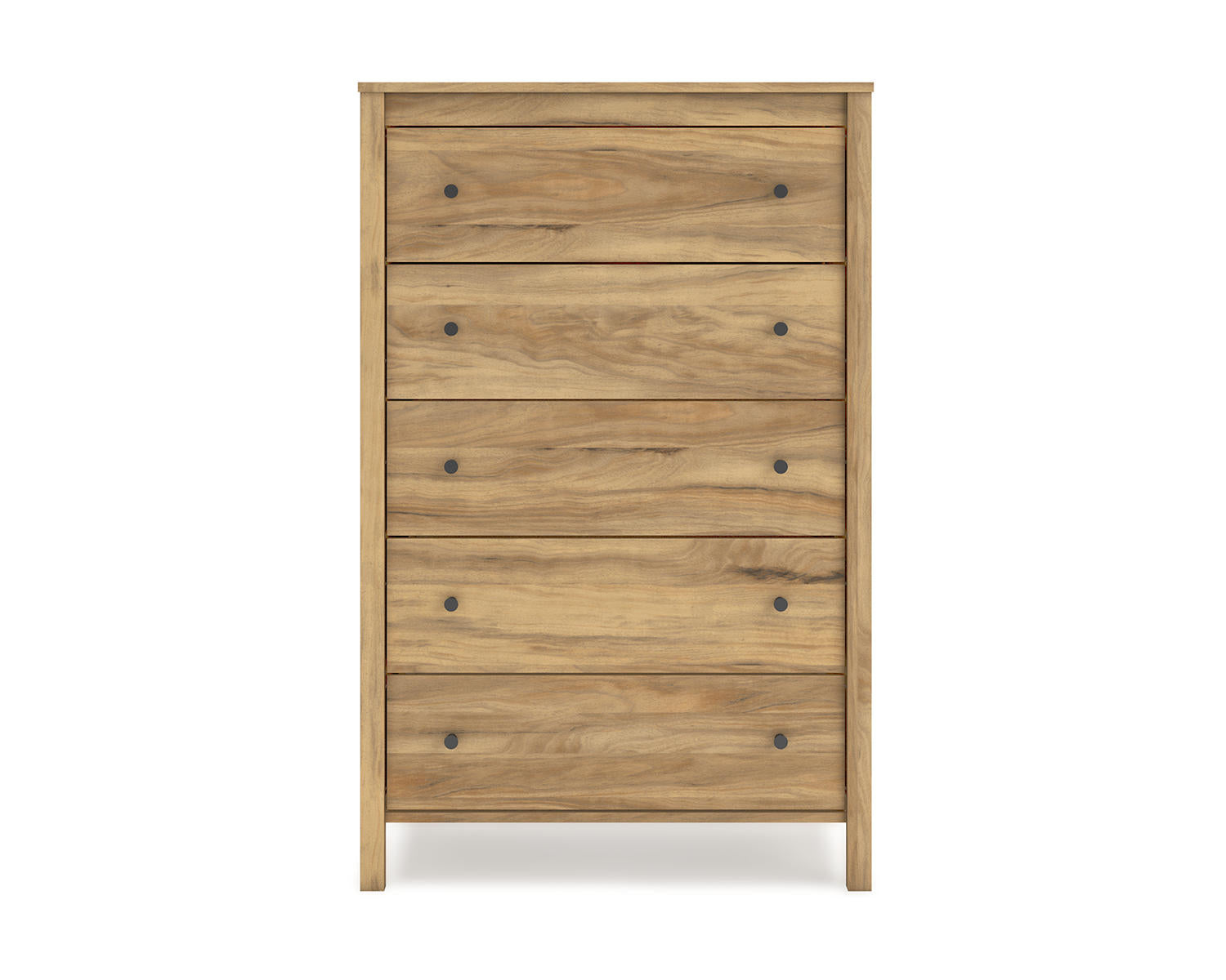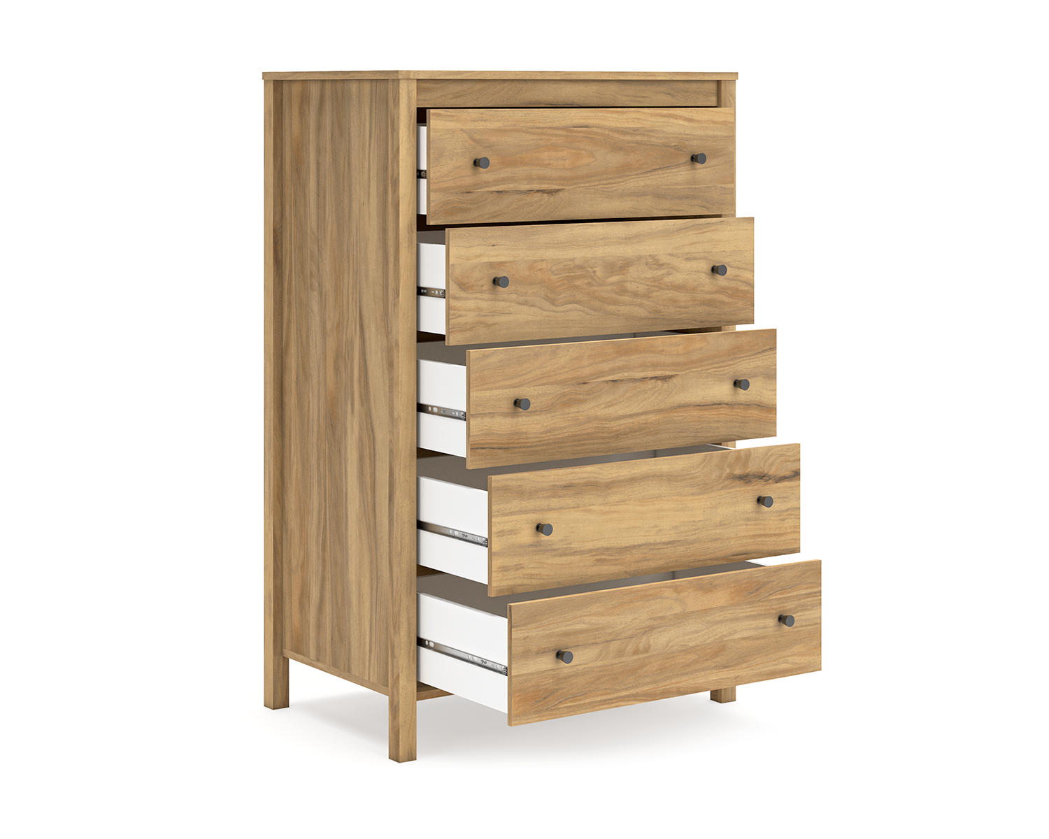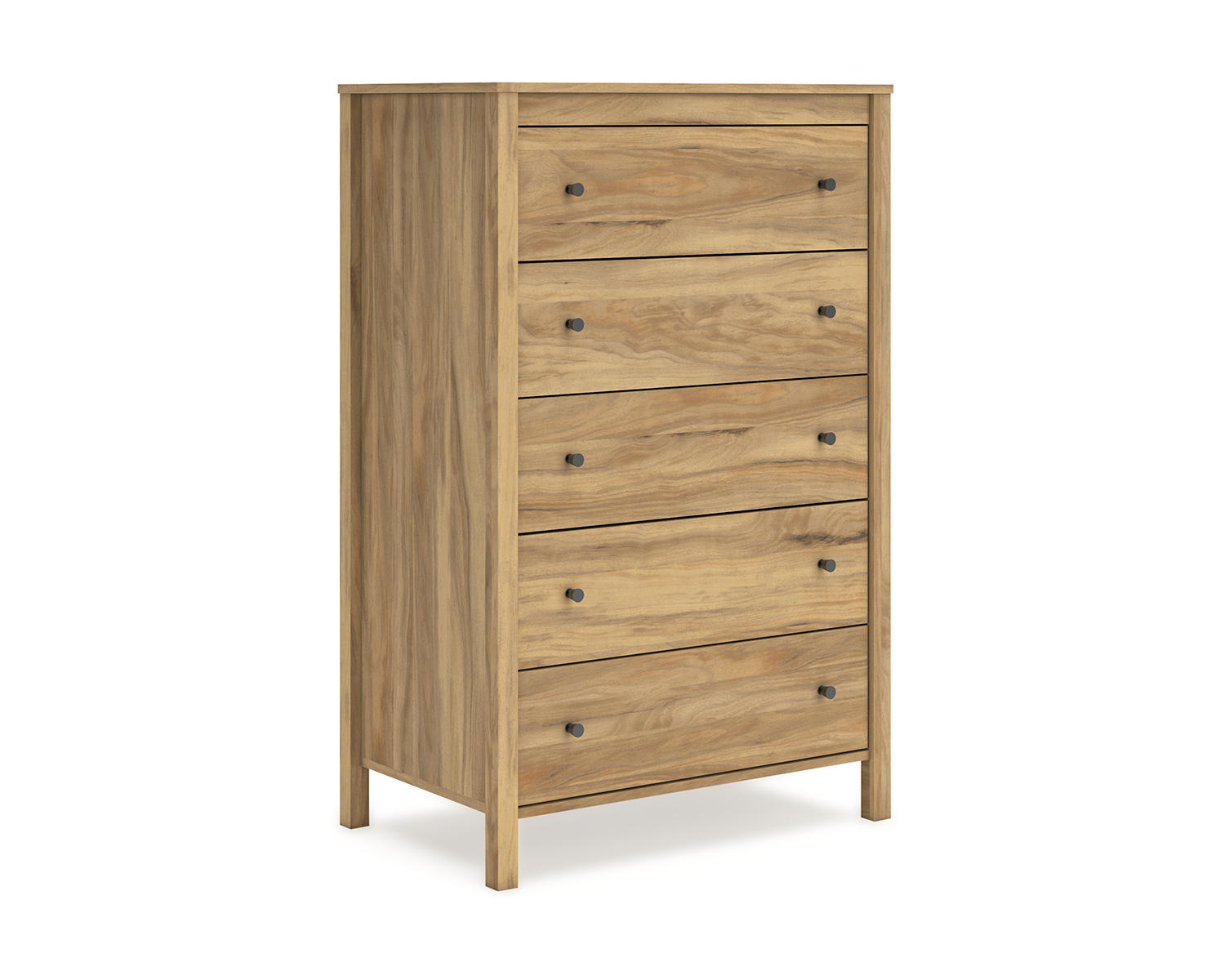 Meet the Bermacy Five-Drawer Chest in a warm light brown finish — a practical storage solution for bedrooms, guest rooms, or anywhere you need to tidy up. This versatile piece combines simple style with ample drawer space, making daily organization effortless.