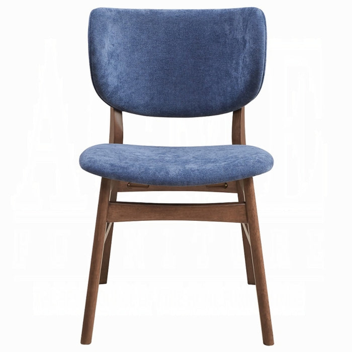 These mid-century-modern-inspired Bevis dining side chairs offer a minimalist silhouette with a subtle flair. Designed for spaces that favor clean lines, they pair a beautiful blue fabric upholstery with a walnut finish frame. The set of two provides an elegant, cohesive look for your dining area, while foam-padded seats and backrests deliver comfort for everyday meals and gathering.