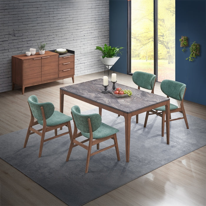 Bevis Side Chair (Set-2) brings mid-century modern flair to your dining space with a minimalist silhouette and a touch of personality. This pair is ideal for intimate dining rooms, breakfast nooks, or any area that values clean lines and timeless style. The striking contrast between the modern green fabric upholstery and the walnut-finish frame creates a warm, inviting look.