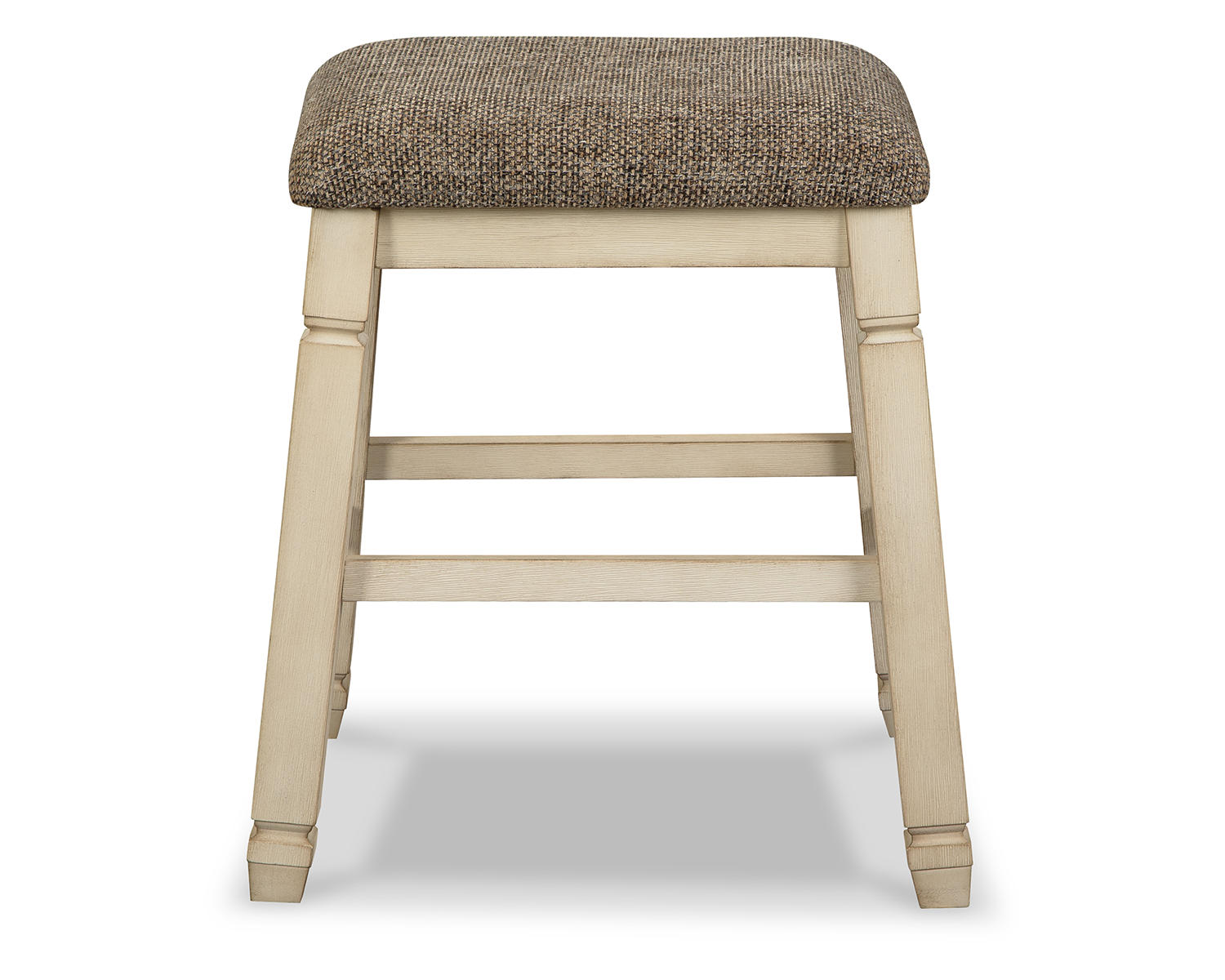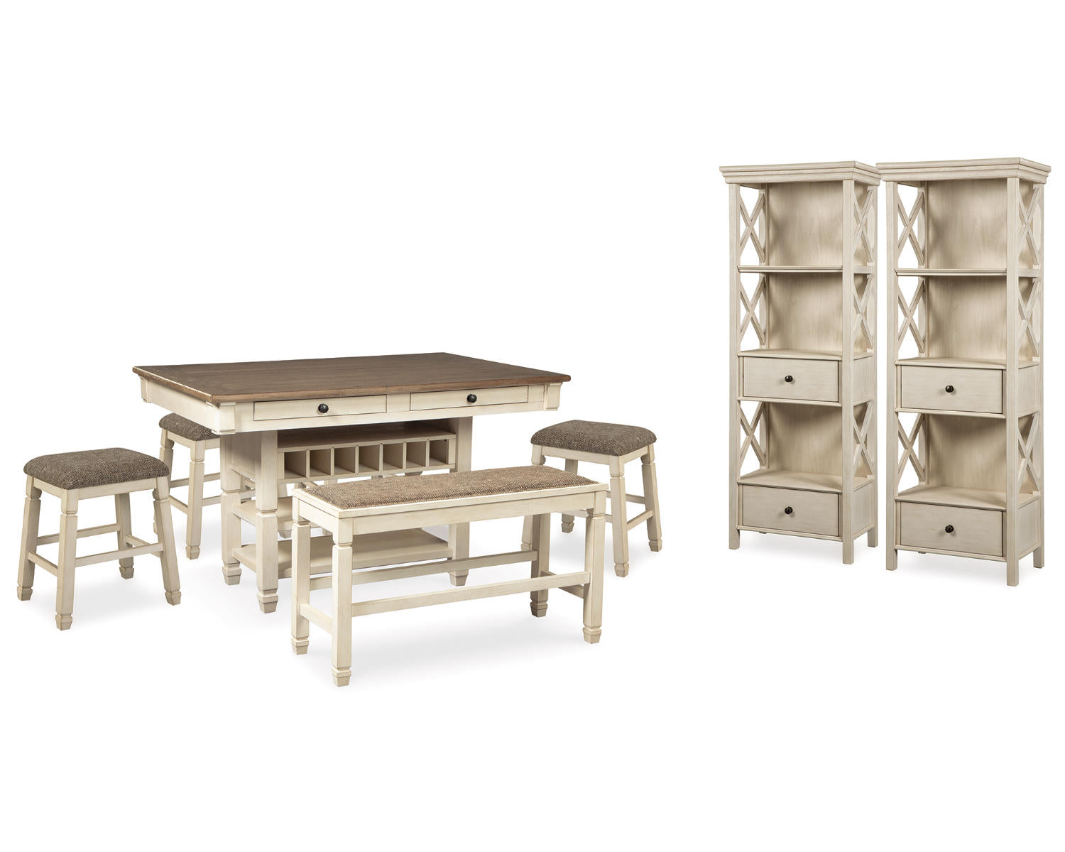 Introducing the Bolanburg Counter Height Dining Set, a complete dining solution for modern kitchens and open-plan spaces. This multi-piece ensemble includes a counter-height table, four stools, a bench, and two display cabinets, all finished in antique white. Ideal for casual family meals, entertaining guests, and showcasing your favorite dishware.