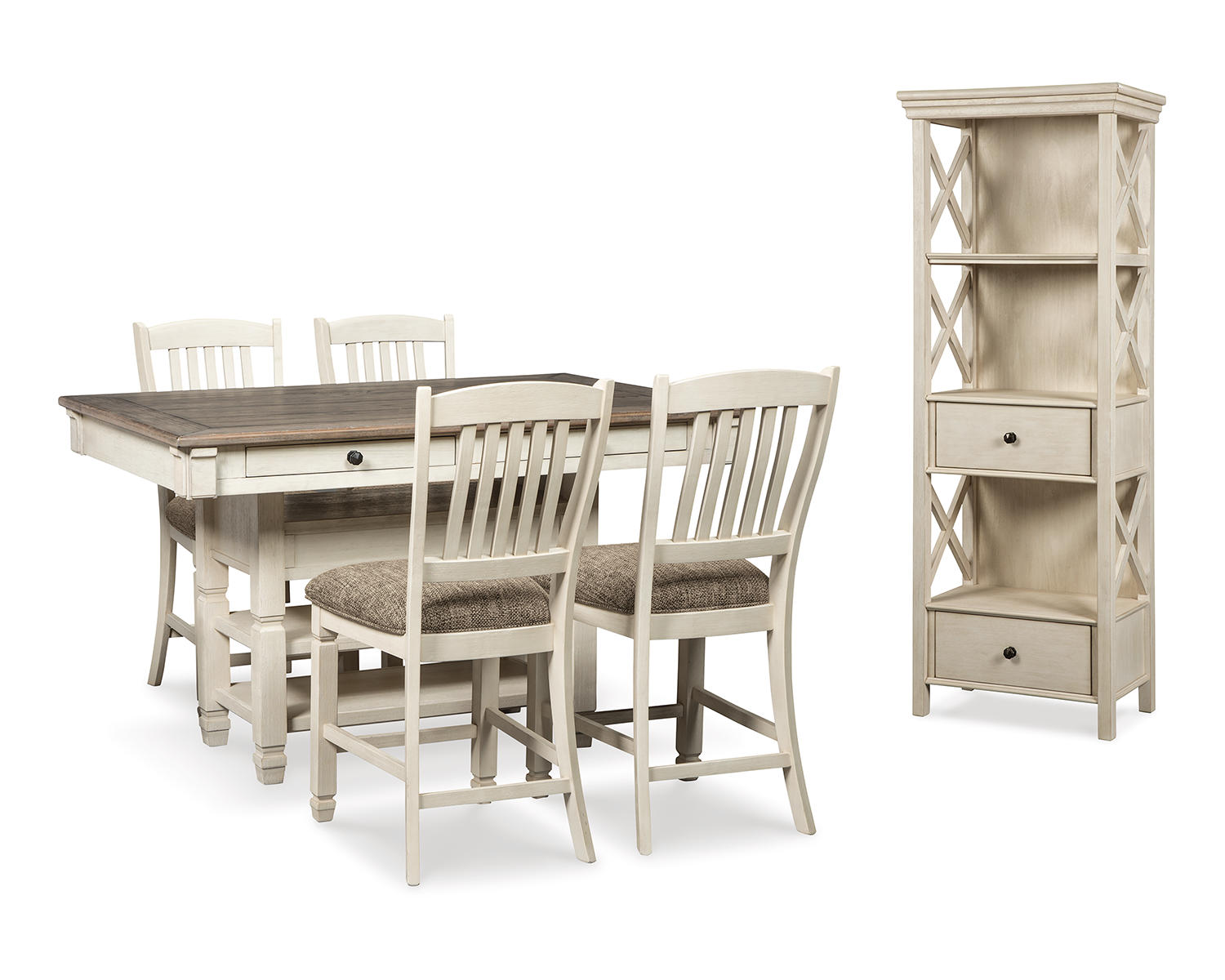 The Bolanburg Counter Height Dining Table and 4 Barstools with Display Cabinet in a two-tone finish blends practical dining space with smart storage. This versatile set is ideal for kitchens, dining nooks, or open-plan rooms, offering a cohesive look and convenient display options. Enjoy everyday meals and casual entertaining with a setup that combines function and style.