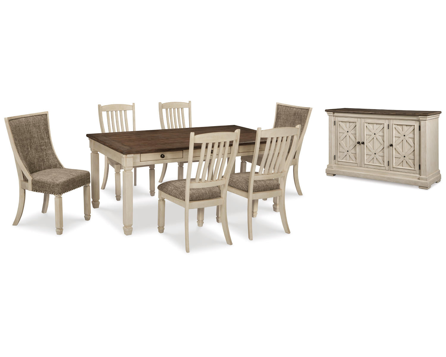 Meet the Bolanburg dining set—a two-tone collection designed to bring warmth and versatility to your dining room. This package includes a dining table, six comfortable chairs, and a matching server, offering a complete solution for everyday meals and family gatherings.