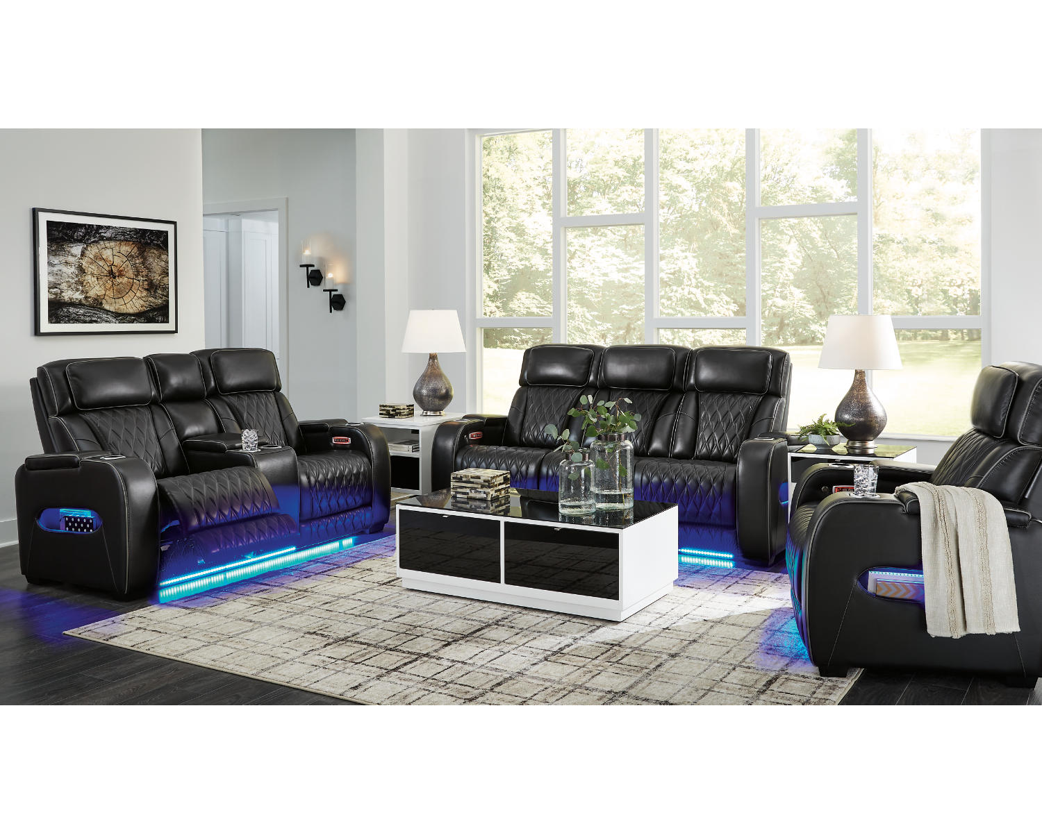 - Three-piece set: power reclining sofa, loveseat, and recliner in a matching black finish.