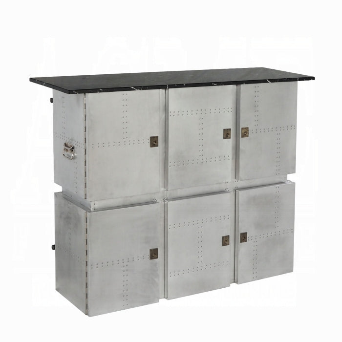 The Brancaster Bar Table with Marble Top is a bold centerpiece that blends the warmth of natural materials with industrial edge. Designed for modern living spaces, it showcases a black marble top paired with an aluminum frame for deep color and lasting durability. Six patchwork aluminum doors add a distinctive touch and practical storage to this statement piece.