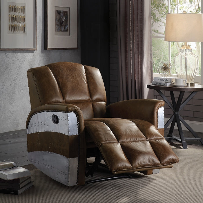 Experience effortless relaxation with the Brancaster Power Motion Recliner, a contemporary chair designed for comfort in living rooms and media spaces. This recliner pairs a refined retro brown top-grain leather finish with modern aluminum accents for a striking, durable centerpiece.