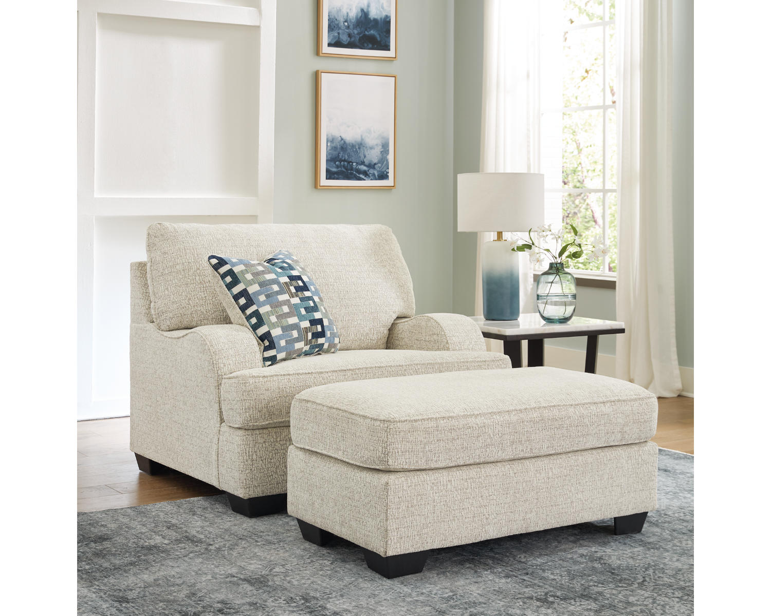 A cozy, oversized chair and ottoman set upholstered in soft flannel, designed for relaxation and everyday living. This duo brings generous comfort to a living space, ideal for lounging, reading, or unwinding after a long day.
