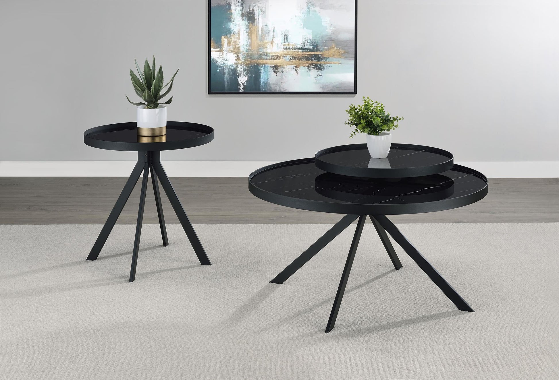 Discover the Briggs 2-piece Round Coffee and End Table Set in Black—a sleek, space-saving pairing designed for modern living spaces. This two-piece set includes a round coffee table and a round end table, offering versatile surfaces for lounging, entertaining, and daily routines. Ideal for small to mid-sized rooms, it blends clean lines with practical function.