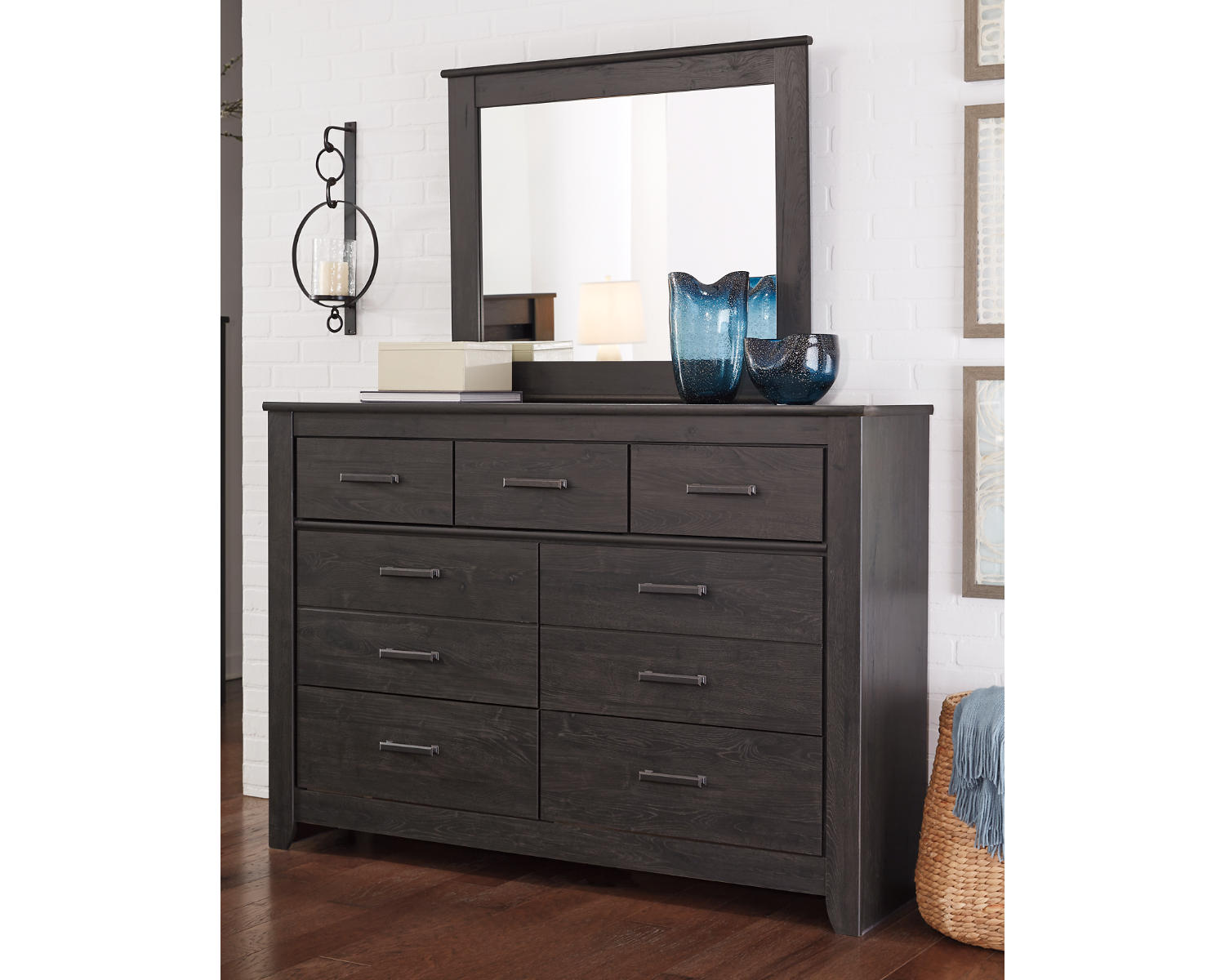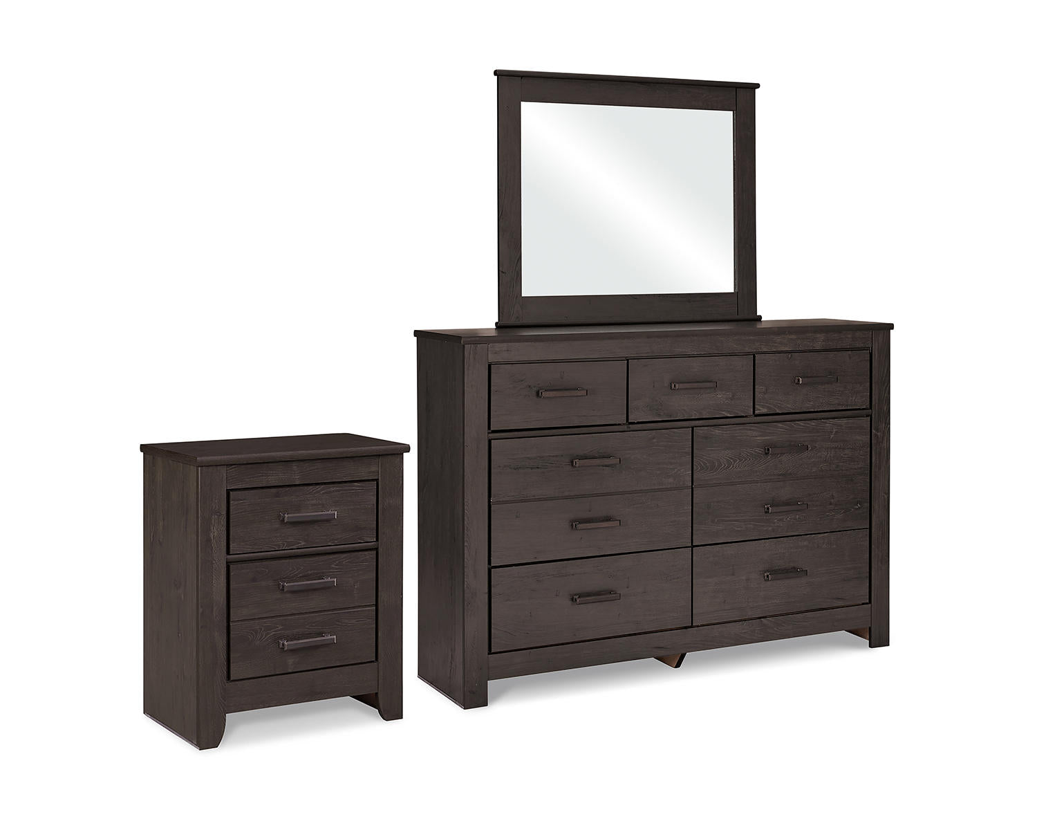 Meet the Brinxton Dresser, Mirror and Nightstand—a complete, coordinated bedroom trio designed for modern spaces. This charcoal-finished set is ideal for small rooms or starter bedrooms, delivering streamlined storage and a polished look in one simple purchase.