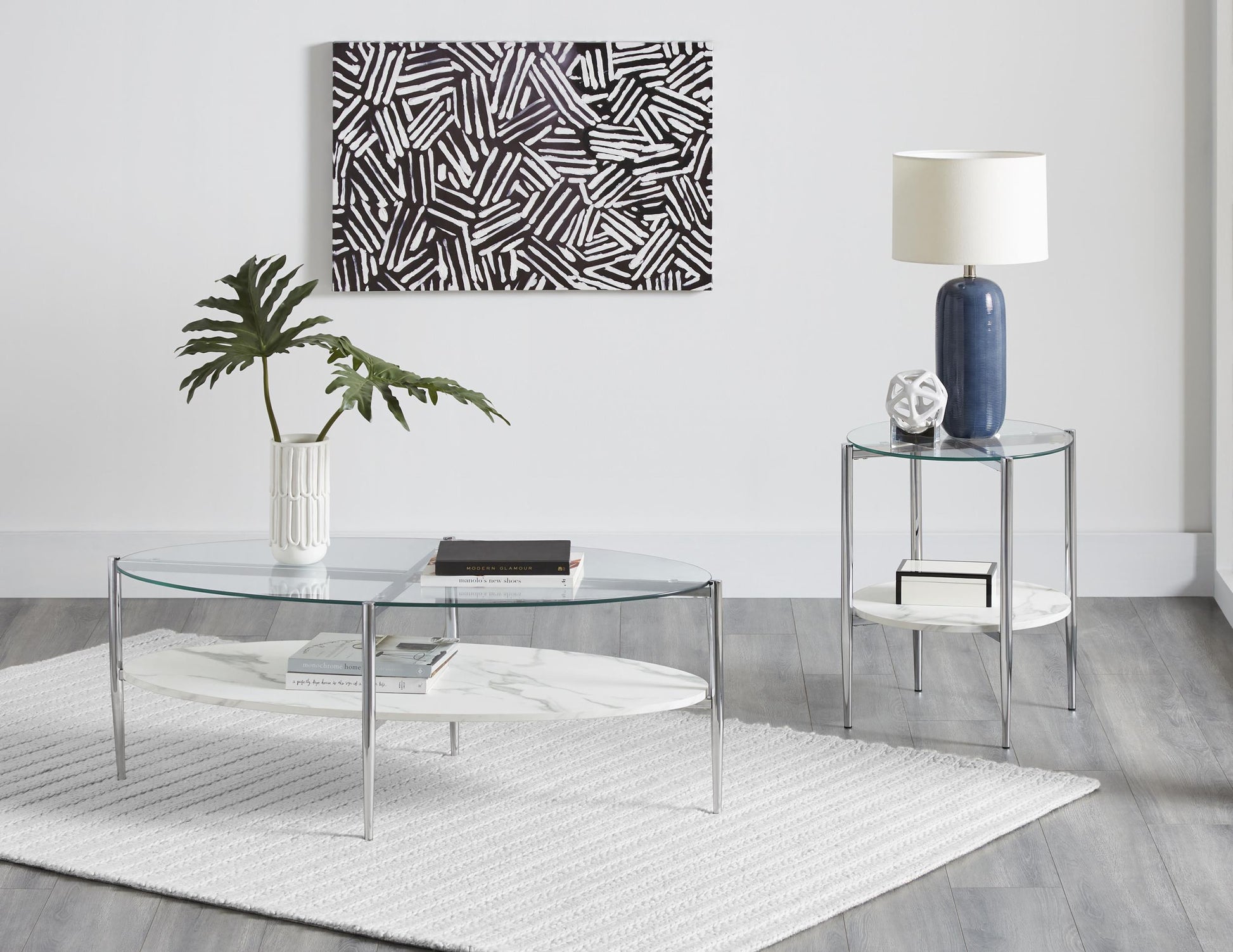 - Two-piece set includes an oval coffee table and an oval end table to create a cohesive look.