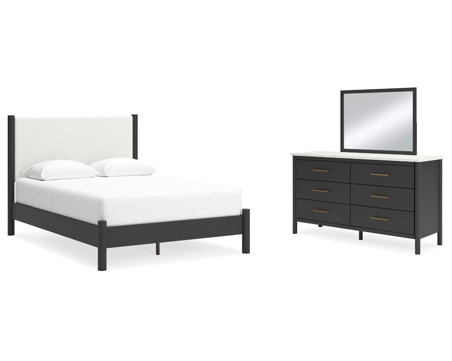 Cadmori Queen Upholstered Panel Bed, Dresser and Mirror — Black/White