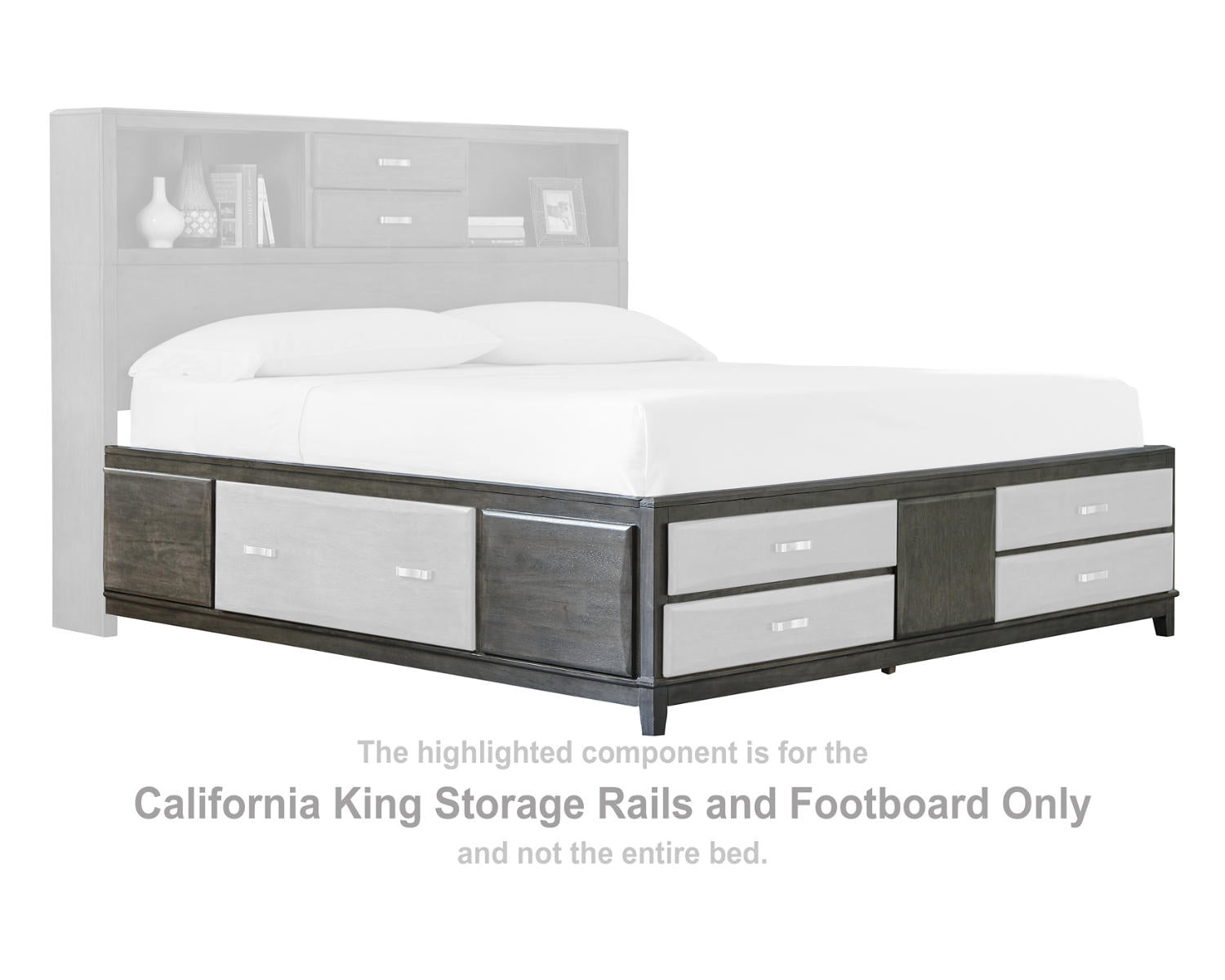 Meet Caitbrook California King Storage Rails and Footboard in Gray. This storage-focused bed component set is designed for California King beds, providing a practical foundation and under-bed organization. With a sleek gray finish, it complements a wide range of bedroom styles.